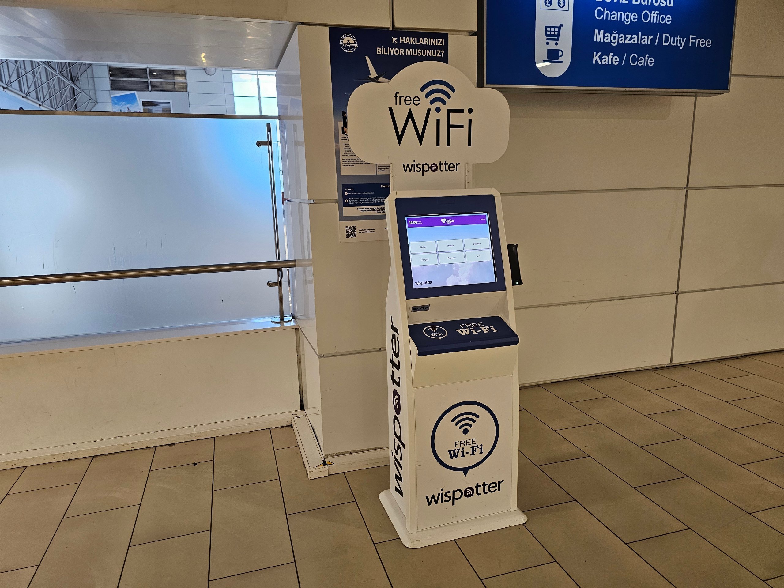 Freewifi hanya tersedia selama 60 menit. Kata sandi hanya dapat diperoleh dari kios-kios resmi yang ada di seluruh bandara, di mana Anda harus memasukkan nomor telepon asli atau memindai paspor Anda.
