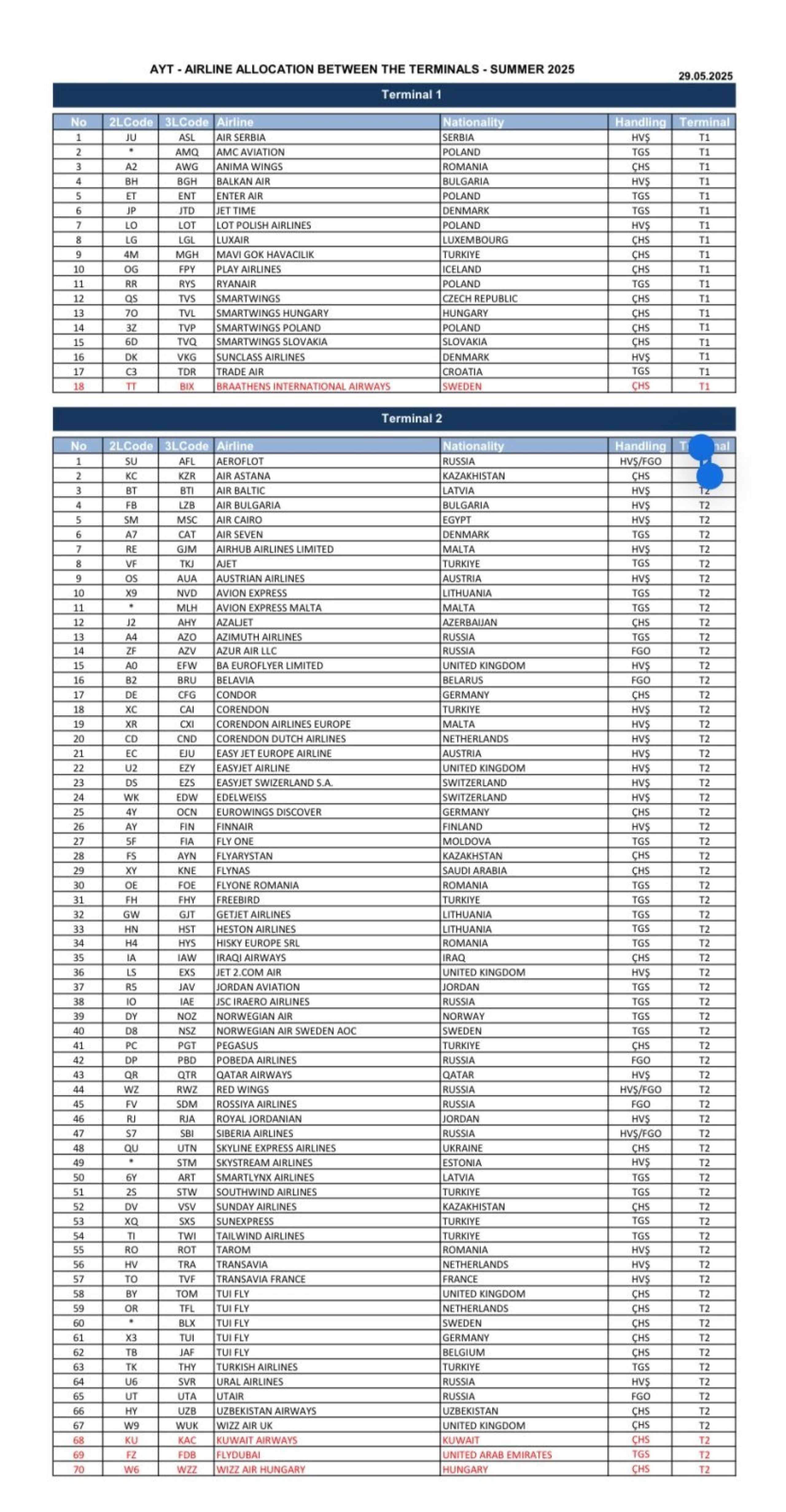 - Terminal 2 - Air Astana, airBaltic, Air Cairo, Bulgaria Air, AJet, Austrian, Avion Express, British Airways, Condor, Corendon Airlines, easyJet, Edelweiss Air, Eurowings, Finnair, FlyOne, Fly Arystan, Flydubai, Flynas, Freebird Airlines, GetJet Airlines, Heston Airlines, Hisky, Iraqi Airways, Jet2.com, Jordan Aviation, Kuwait Airways, Norwegian, Pegasus Airlines, Qatar Airways, Royal Jordanian, Skyline Express Airlines, Smartlynx Airlines, Southwind Airlines, Sunday Airlines, SunExpress, Tailwind Airlines, Tarom, Transavia, Tui Fly, Turkish Airlines, Uzbekistan Airways, Wizz Air