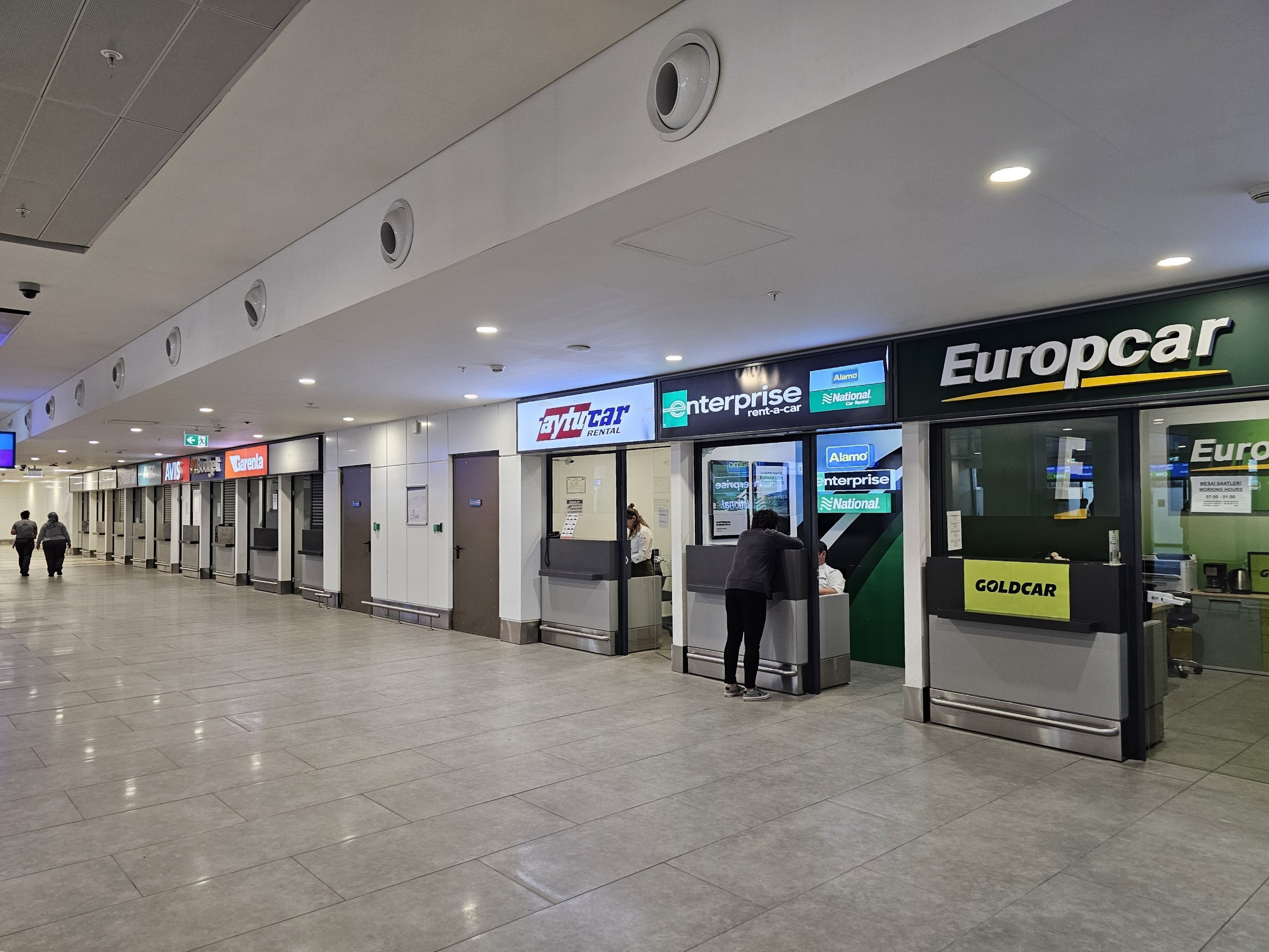 Konter penyewaan mobil terletak di aula kedatangan di semua terminal.
