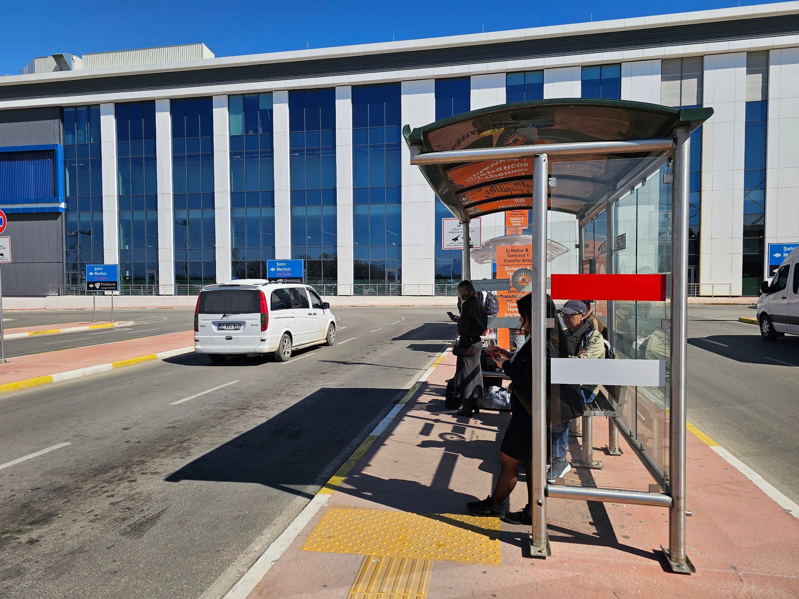 Trem T1A... ada bus antar-jemput gratis dari kedatangan T2 ke halte bus. Jika Anda berkendara dari pusat kota ke bandara, berhati-hatilah, ada juga trem T1B ke Aksu di jalur ini (dapat digunakan untuk mengunjungi Perge).