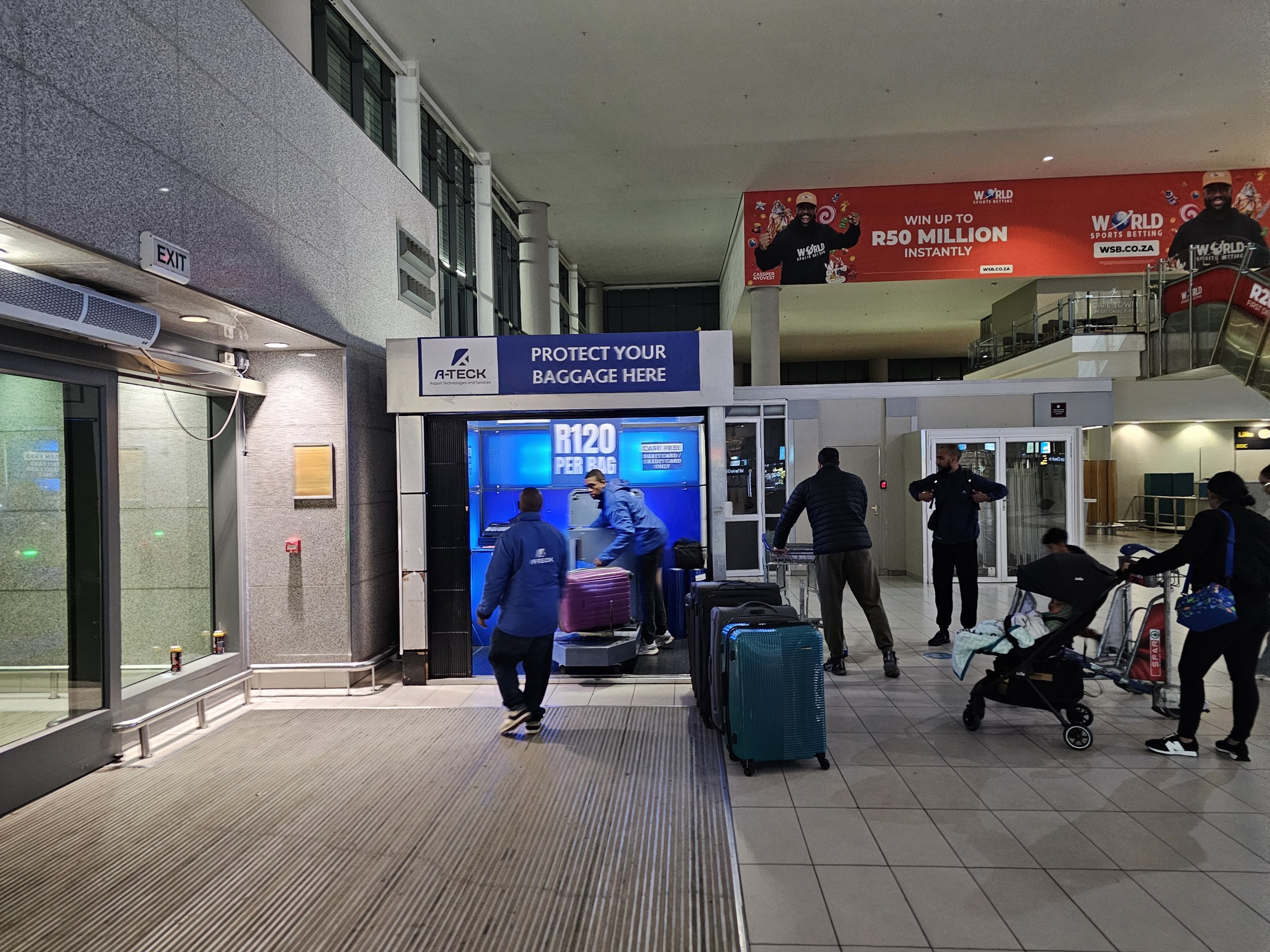 Anda dapat membungkus koper Anda dengan film pelindung di ruang tunggu keberangkatan.