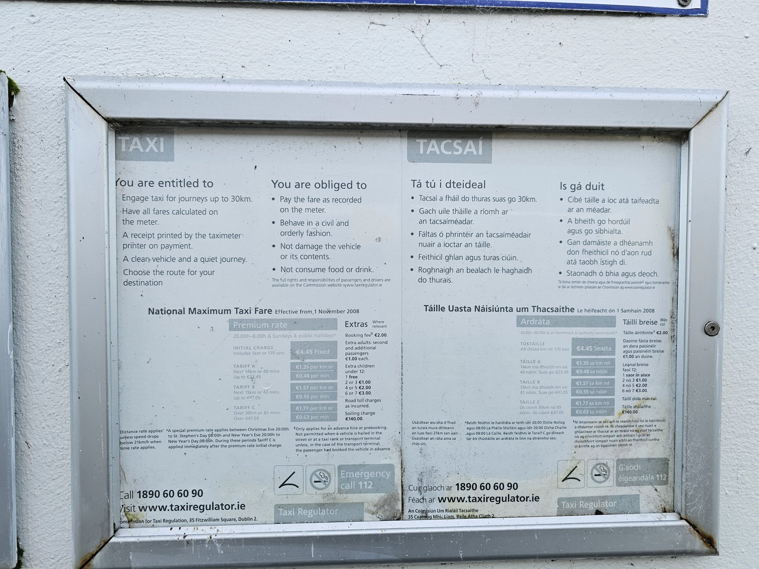 Meskipun taksi resmi harus menggunakan argo, Anda mungkin akan menemukan pengemudi taksi nakal yang akan menawarkan tarif tetap 40 euro untuk perjalanan ke Killarney plus pilihan untuk membayar tunai saja.