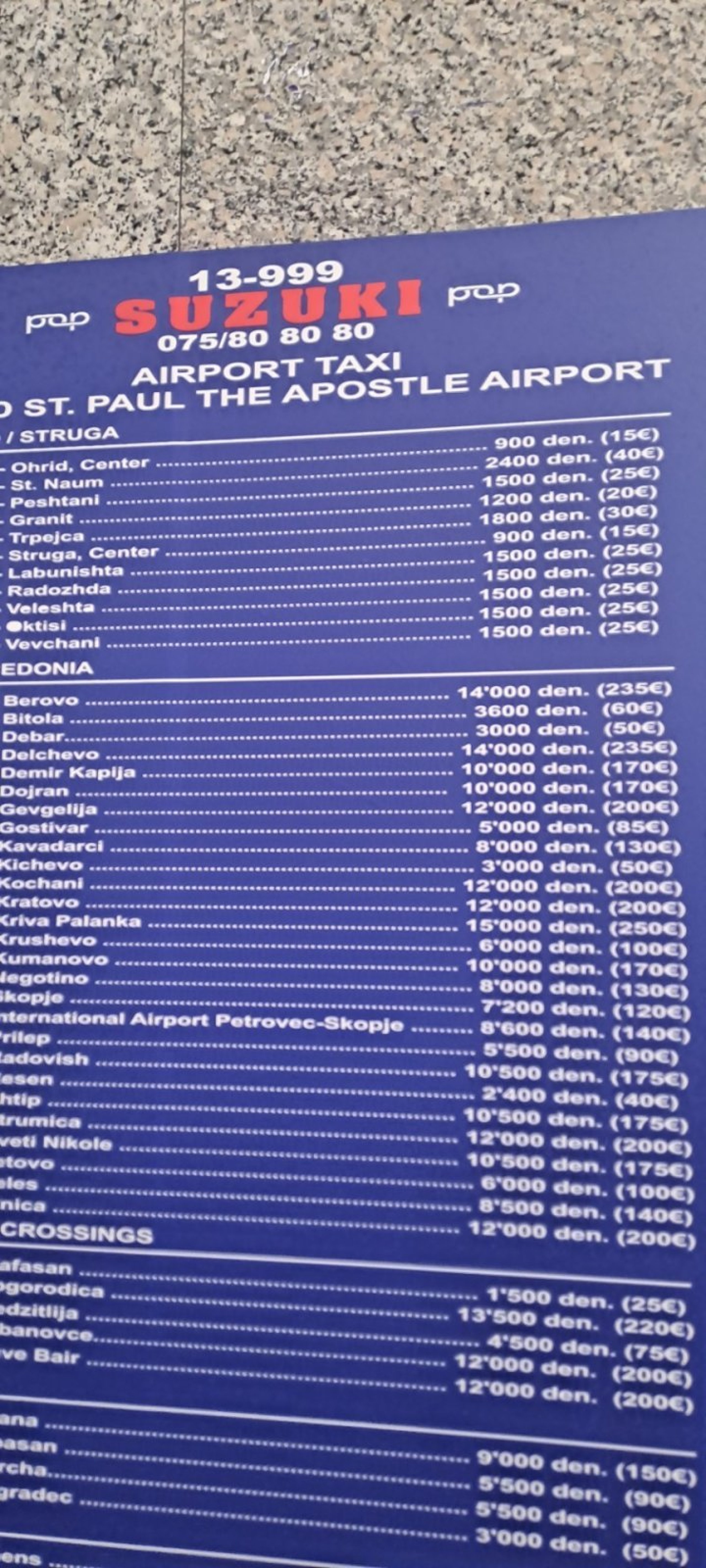 Taksi di sini tidak menggunakan argo, dan ongkosnya berdasarkan harga resmi yang tersedia di situs web bandara: ohd.airports.com.mk/taxi.