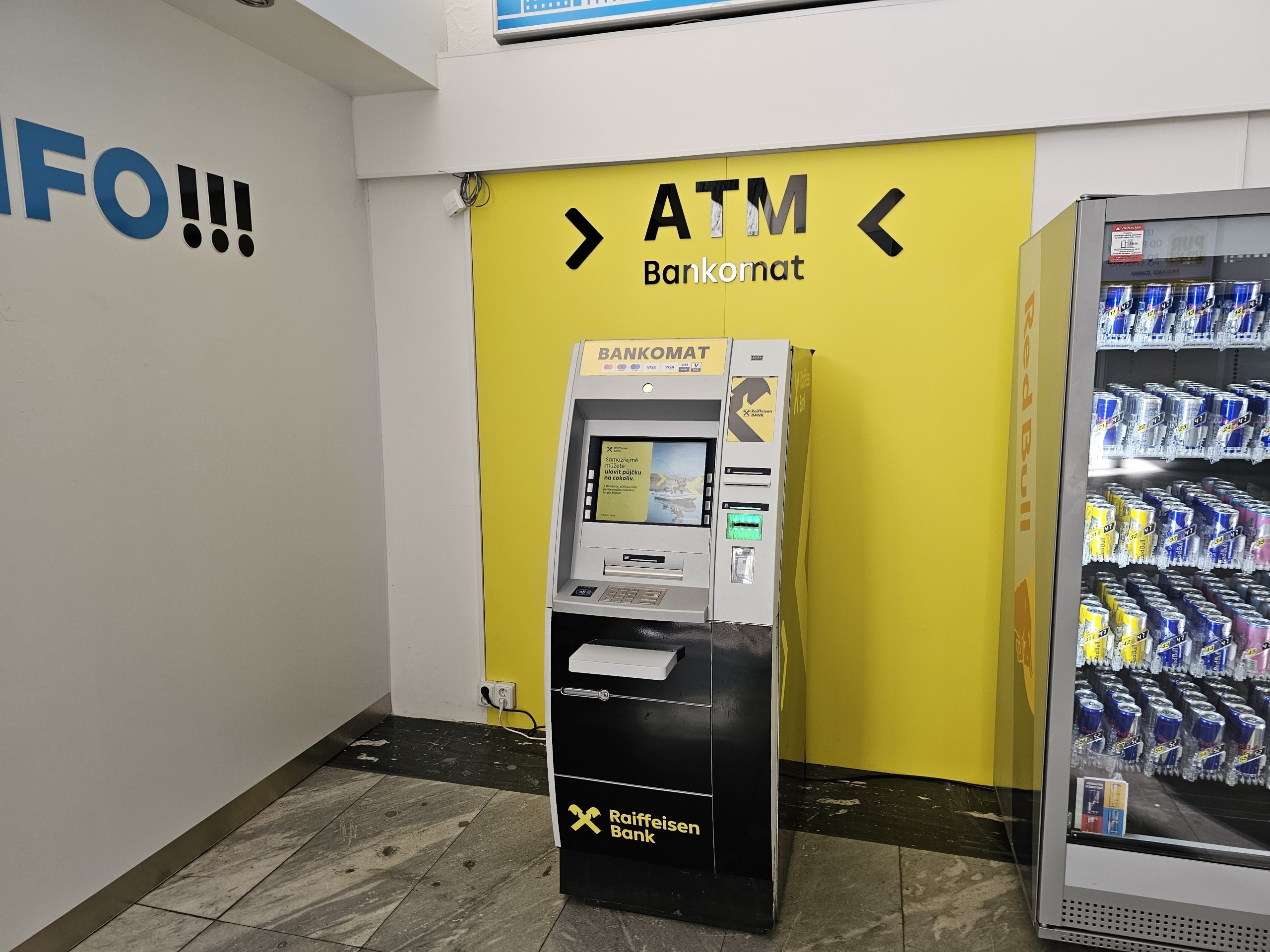 Anda dapat menggunakan ATM Raiffeisenbank di area umum aula kedatangan.