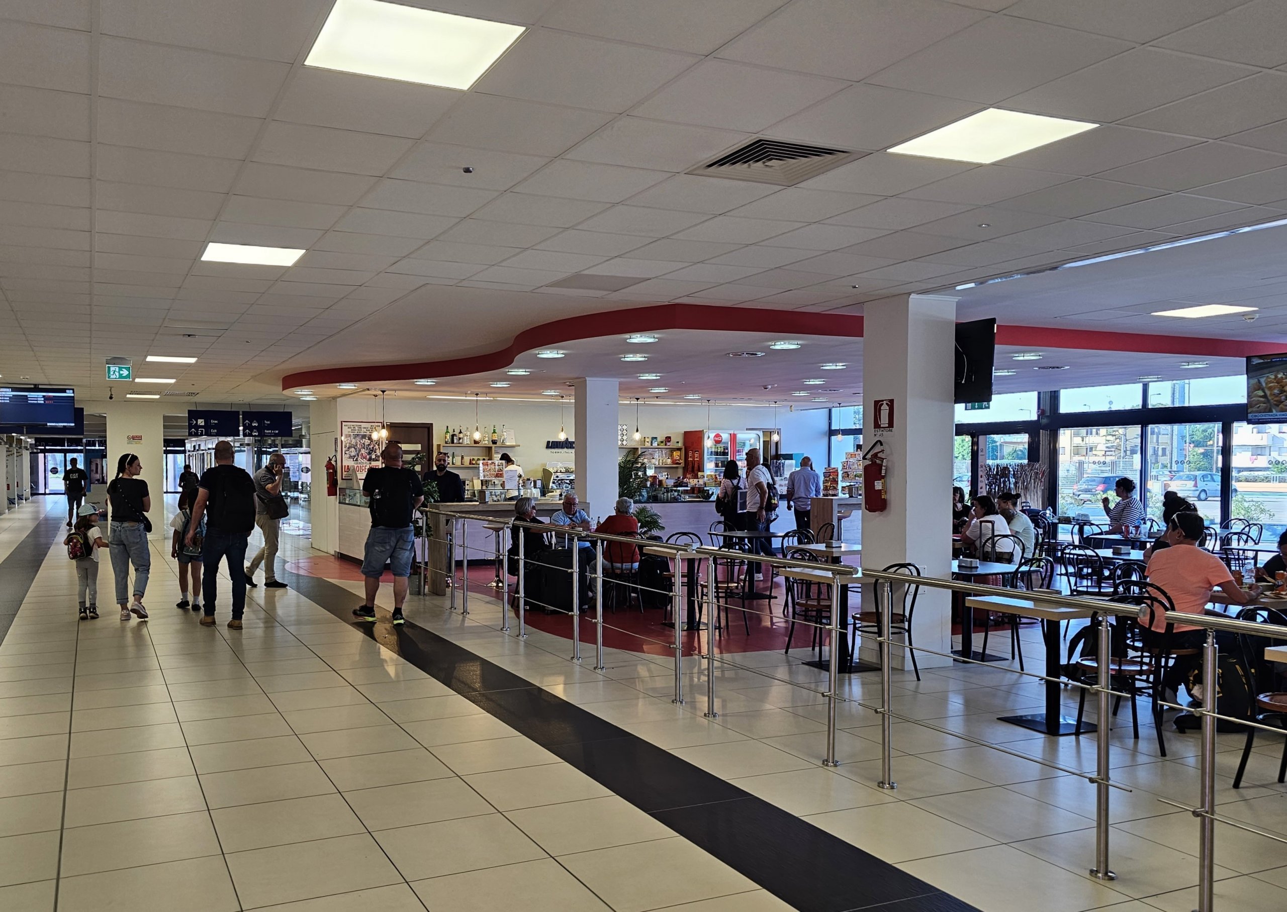 Anda akan menemukan restoran dari operator yang sama sebelum dan sesudah pemeriksaan keamanan. Jangan berharap mendapatkan makanan panas yang tidak terlalu enak yang harganya pasti tidak sesuai dengan kualitasnya. Namun, harga minuman dan makanan kecil serupa dengan harga di kota.