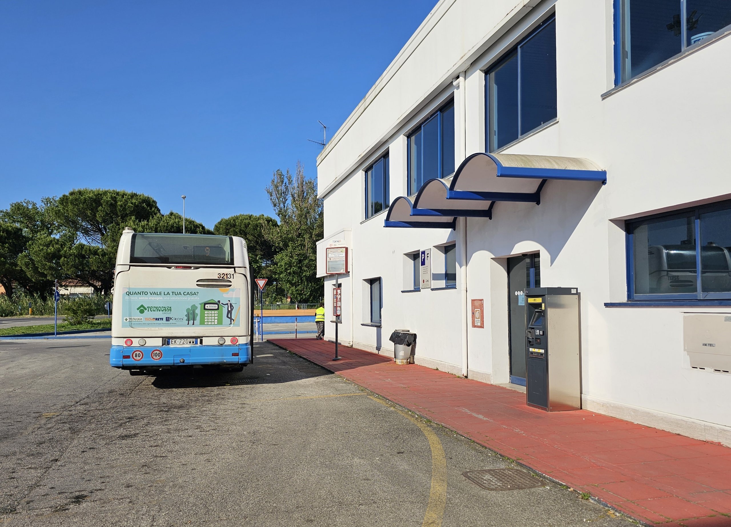 Halte bus di stasiun utama berada tepat di seberang gedung di seberang jalan dari loket tiket yang menjual tiket ke San Marino dan di sebelah Burger King.
