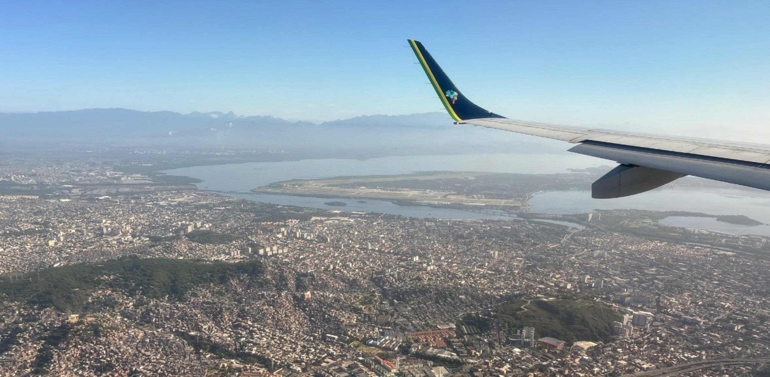 Pemandangan bandara Galeão di Ilha do Governador selama penerbangan GRU-SDU dengan Embraer-195 dari Azul Linhas Aéreas.