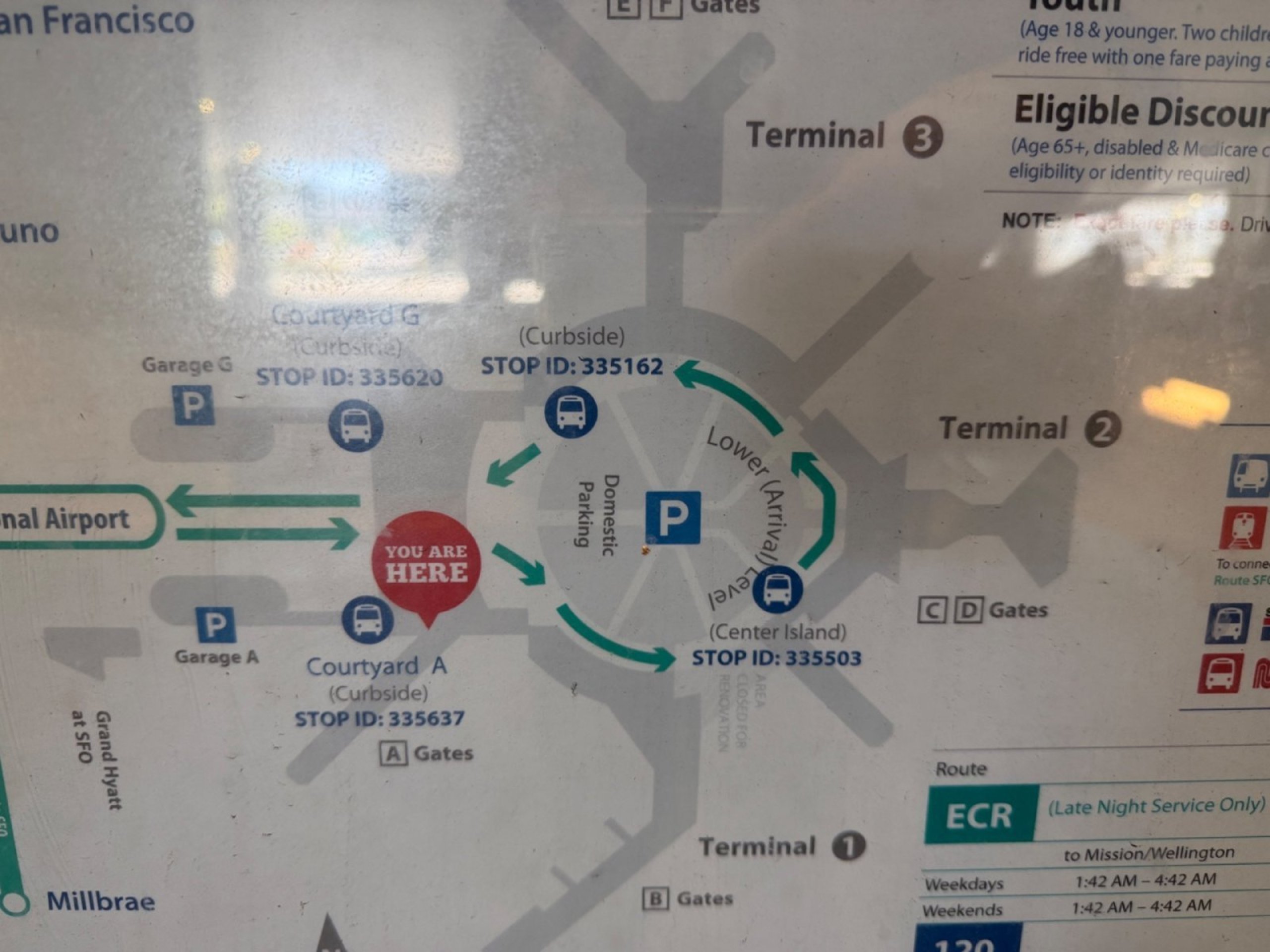 Kereta terakhir dari bandara ke San Francisco dan Oakland masing-masing berangkat pada pukul 0:00 (Jalur Kuning) dan 20:59 (Jalur Merah).