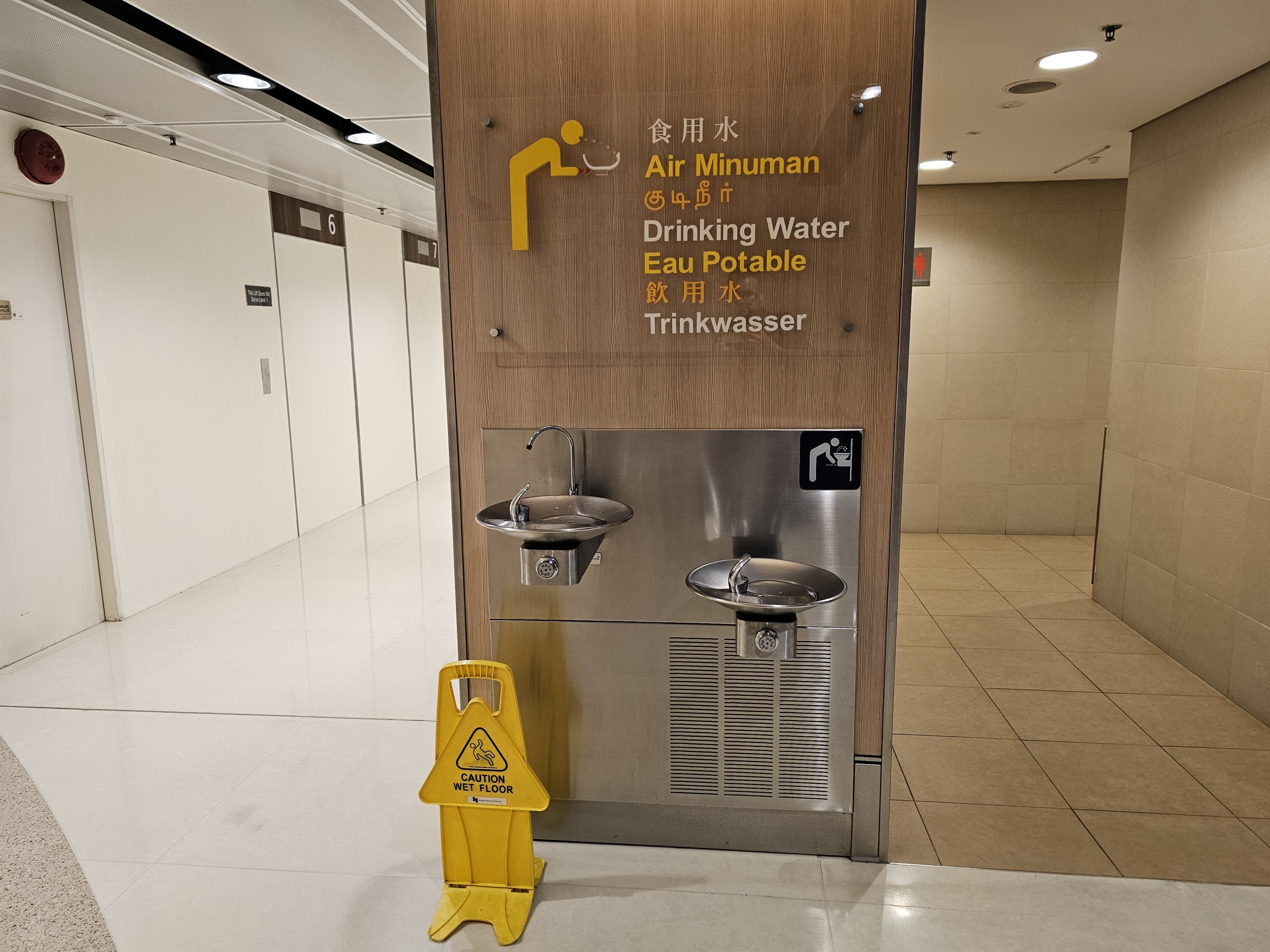 Berendamlah secara gratis di banyak air mancur air minum dingin yang terletak di semua terminal setelah pemeriksaan keamanan.