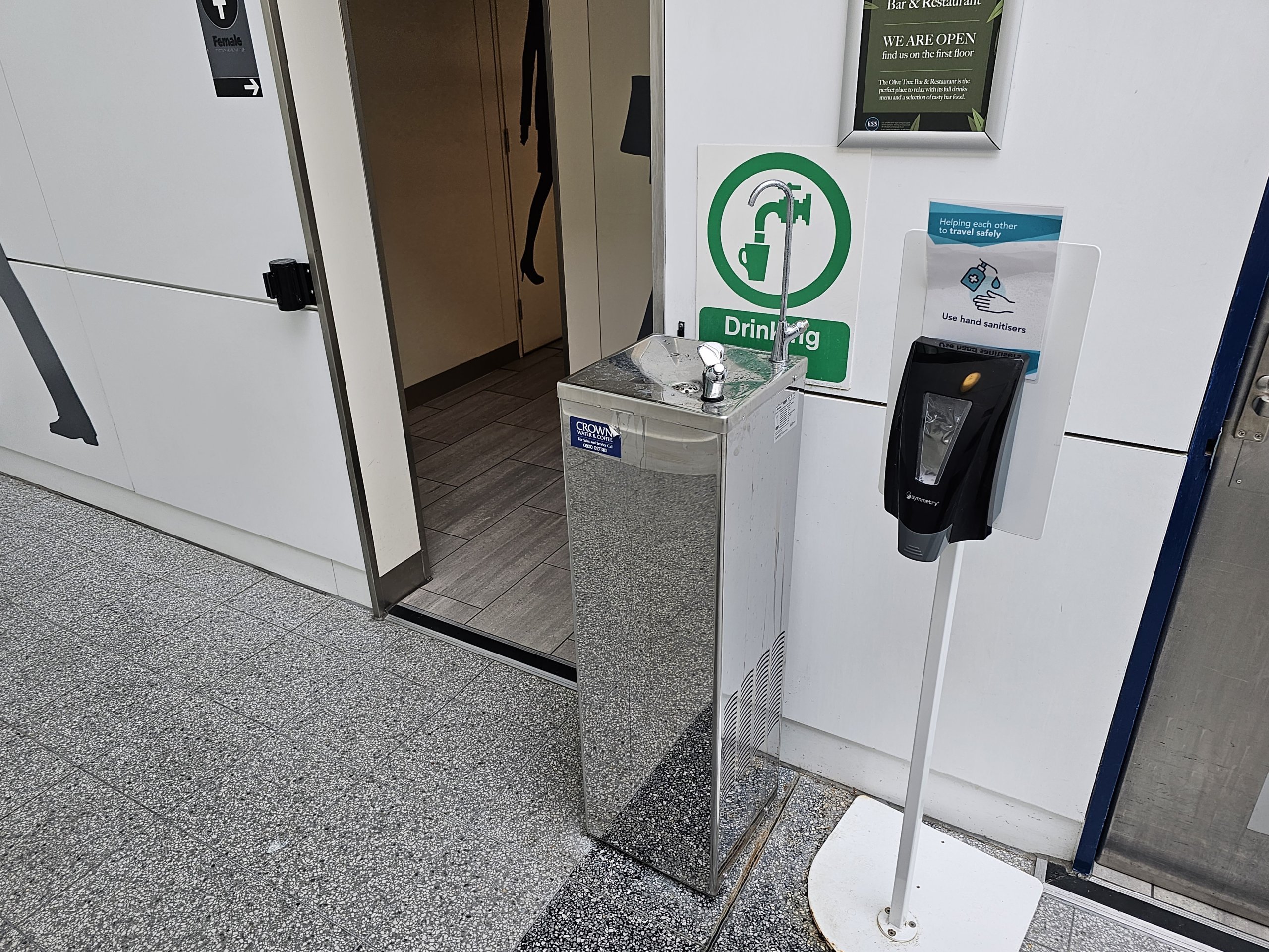 Anda dapat mengisi botol Anda sendiri dengan air minum dingin gratis dari air mancur di dekat toilet setelah pemeriksaan keamanan.