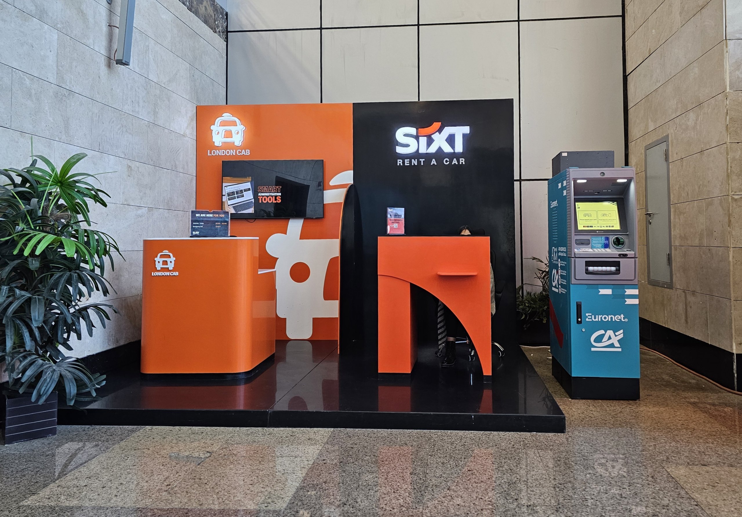 Terdapat cabang penyewaan mobil Sixt tepat di dalam terminal, namun perusahaan penyewaan mobil lainnya juga menawarkan layanan "Meet and Greet", di mana seorang staf akan menunggu Anda di aula kedatangan dengan mobil Anda.