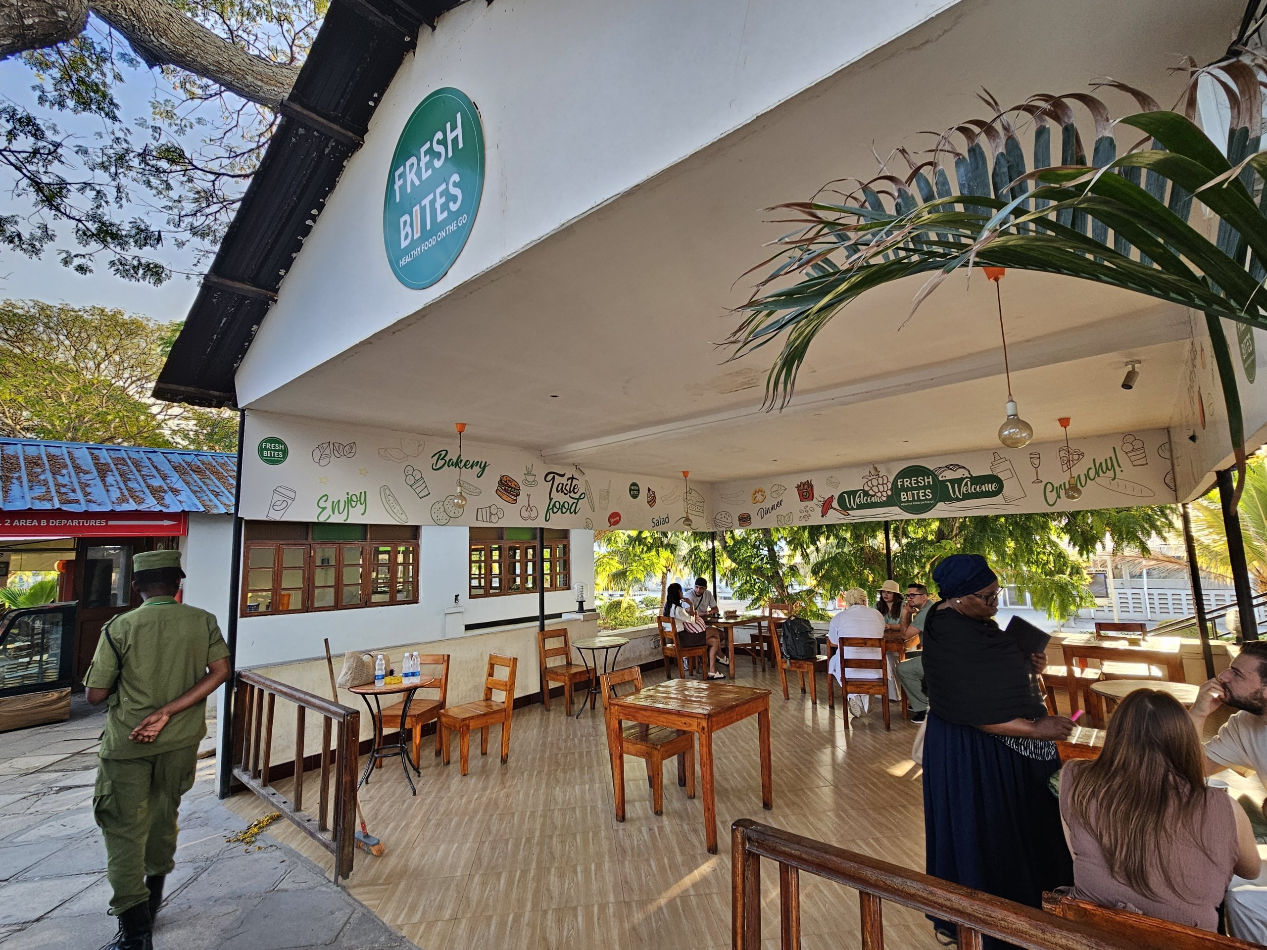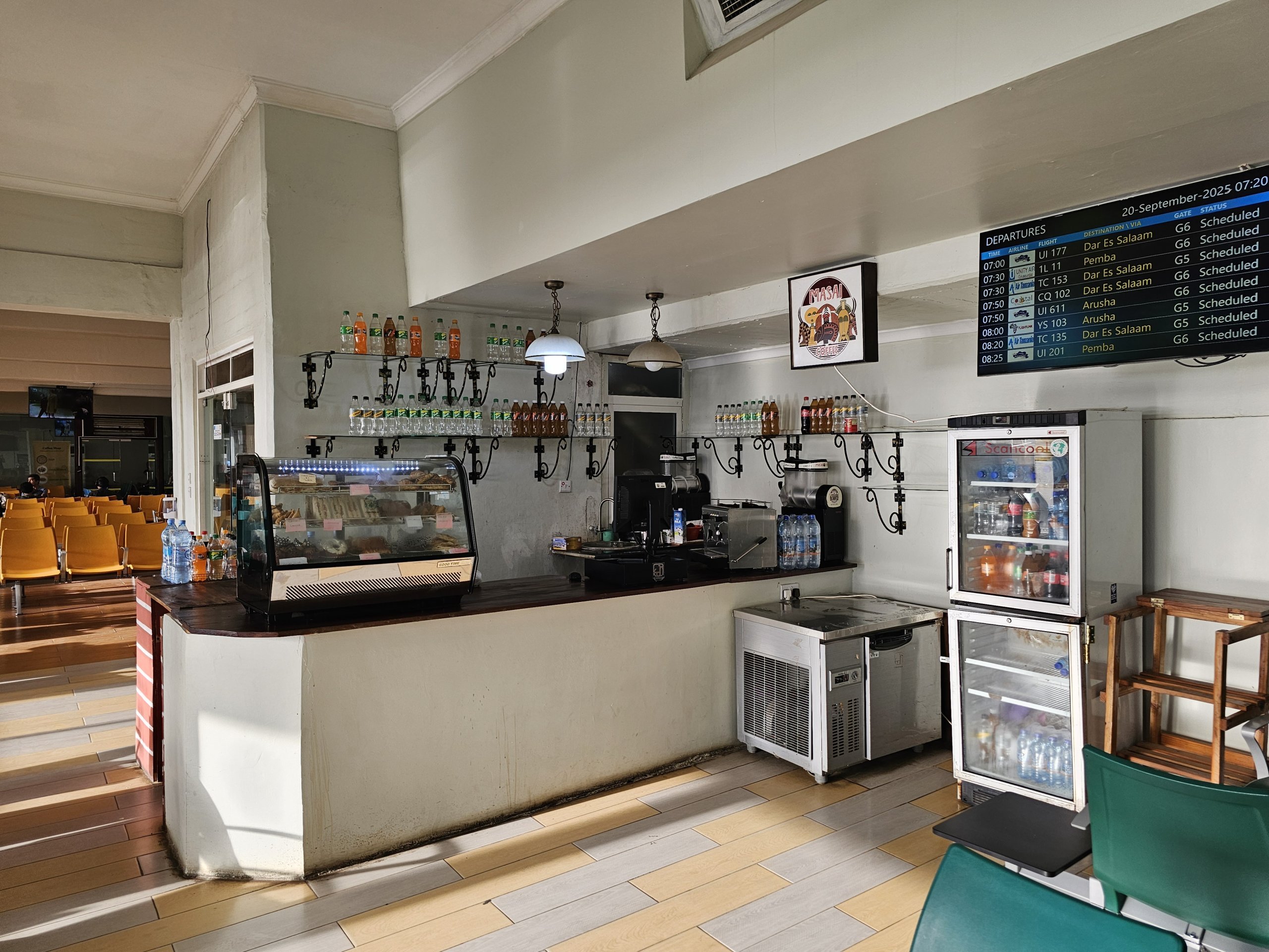 Di terminal internasional Anda akan menemukan sebuah restoran, bar, dan bistro kecil setelah pemeriksaan keamanan. Harga makanan di sini beberapa kali lebih tinggi daripada di tempat lain di Zanzibar.