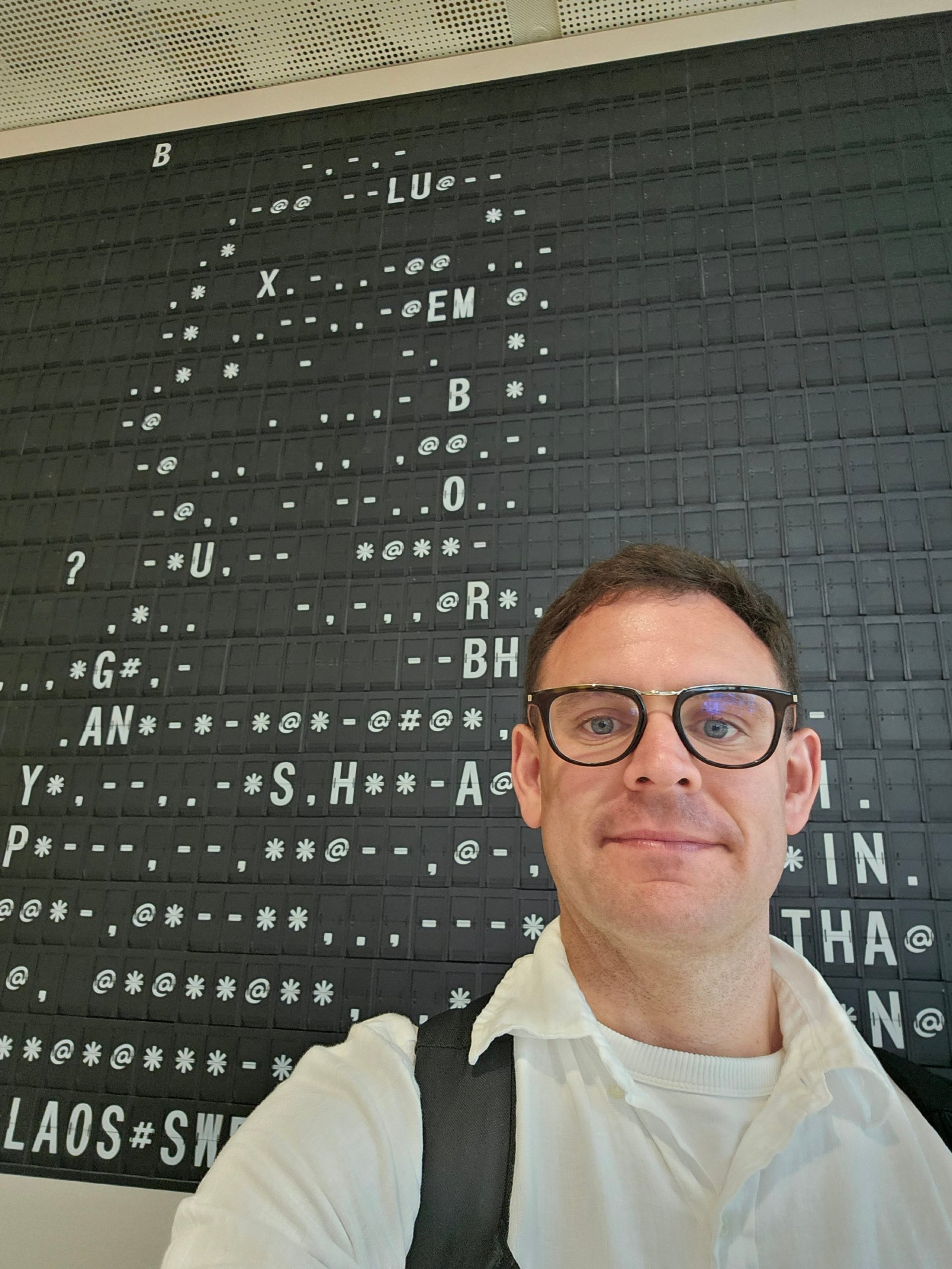 Anda berdiri di depan papan keberangkatan yang sudah tua dan menggunakan sandal jepit untuk membuat garis besar.