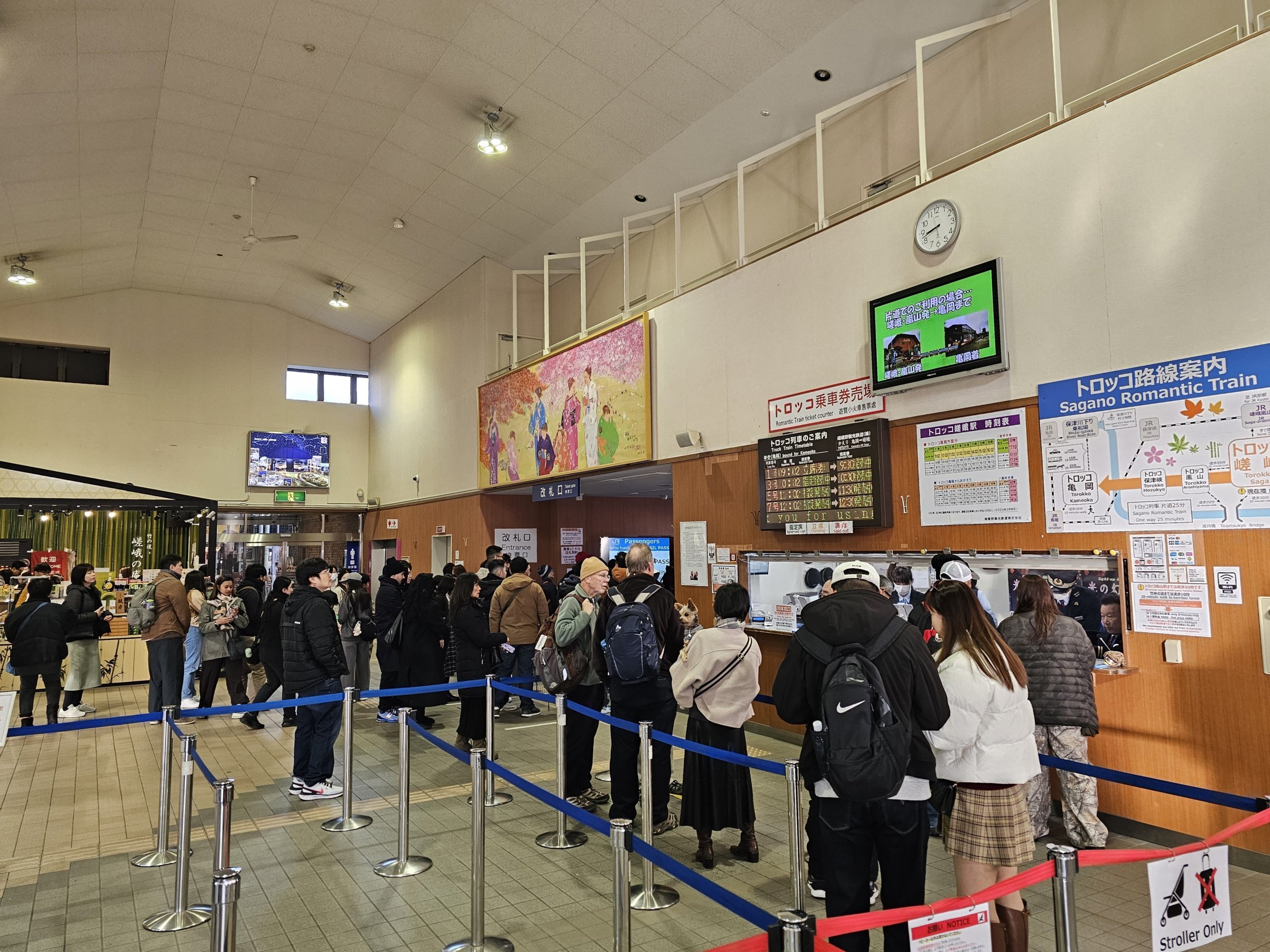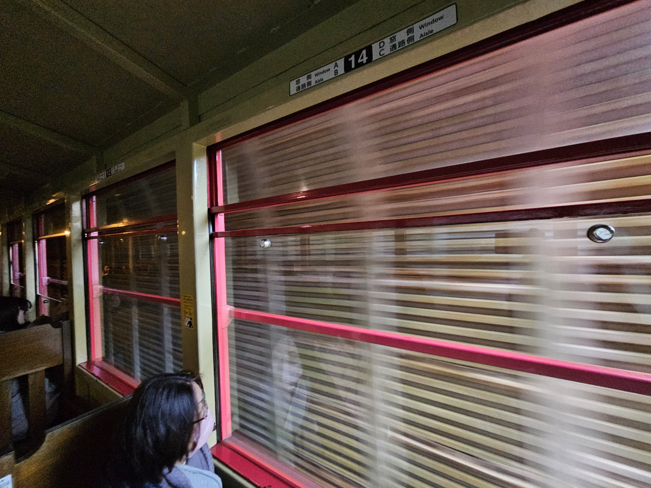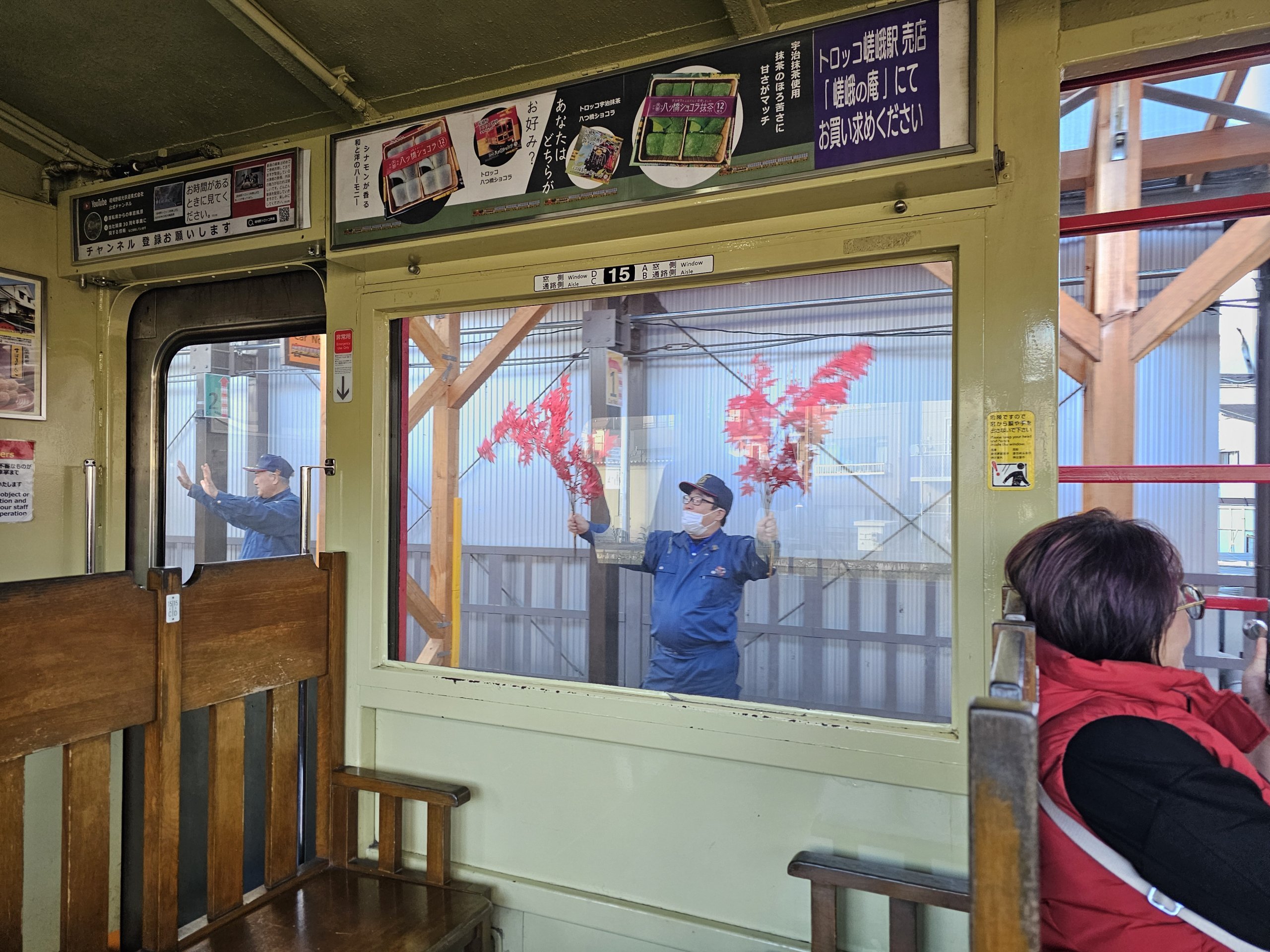Naik ke kereta diatur dengan baik dan saat kami pergi, staf melambaikan tangan dengan dedaunan berwarna-warni. Agak kekanak-kanakan, tetapi karena ada banyak anak-anak di kereta, itu juga sangat menyenangkan.