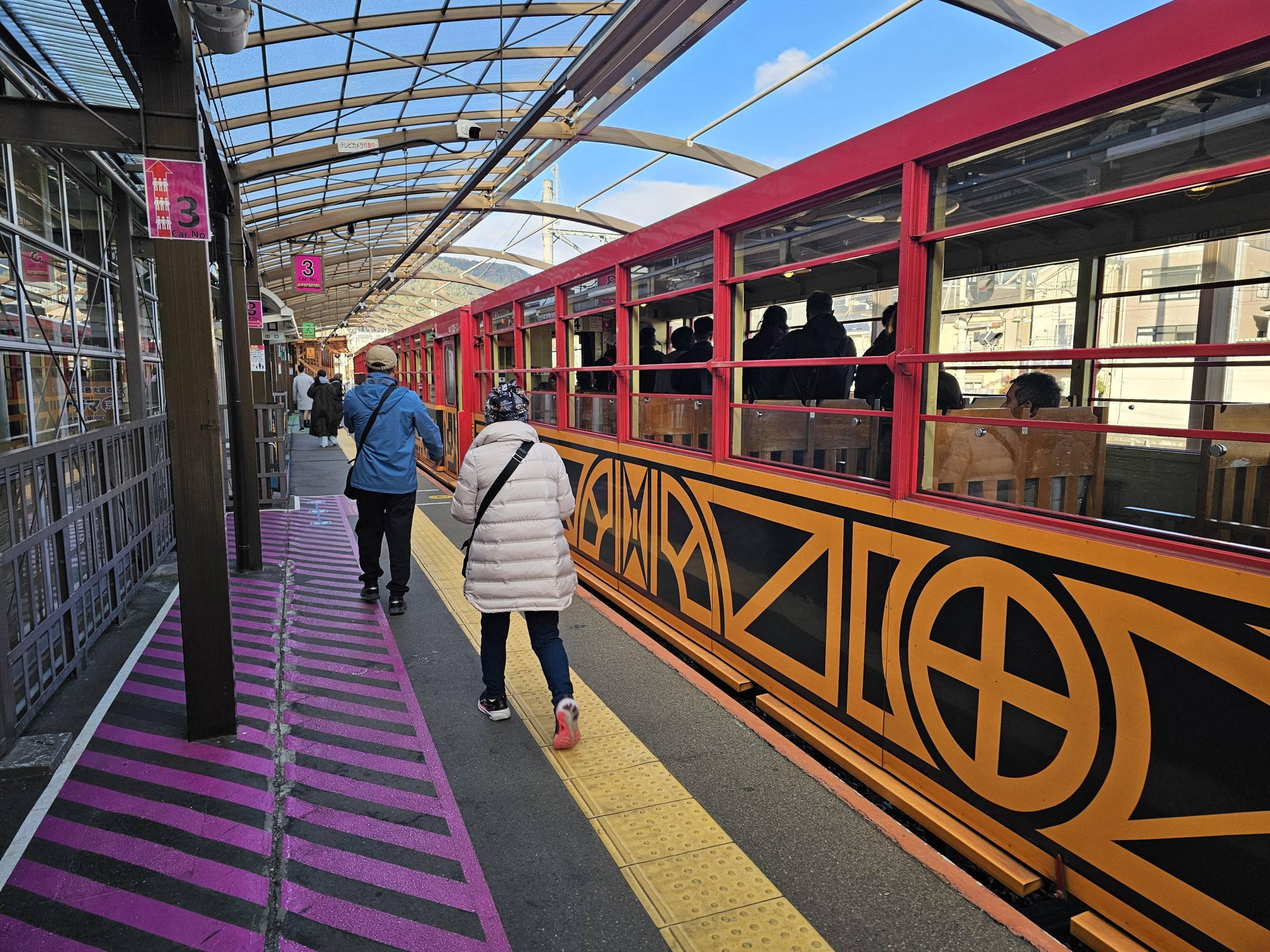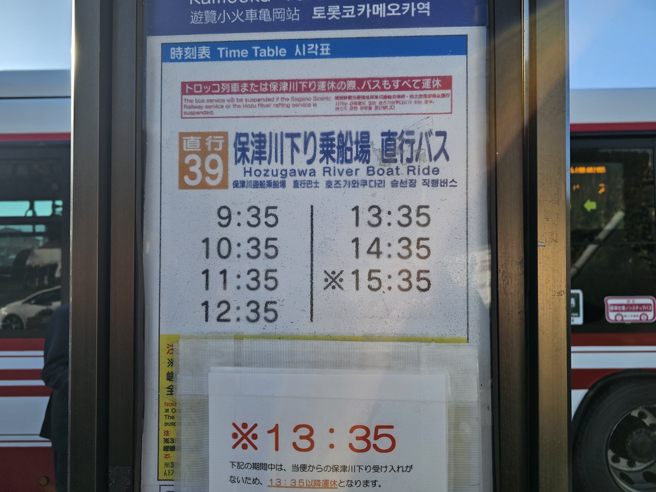 Dari kereta Sagano yang romantis, bus jalur 39 berjalan langsung ke dermaga, menghubungkan ke setiap kereta, dan waktu tempuhnya sekitar 10 menit. Anda bisa membayar ongkos bus dengan uang tunai atau kartu transportasi (ICOCA, Suica, atau lainnya).