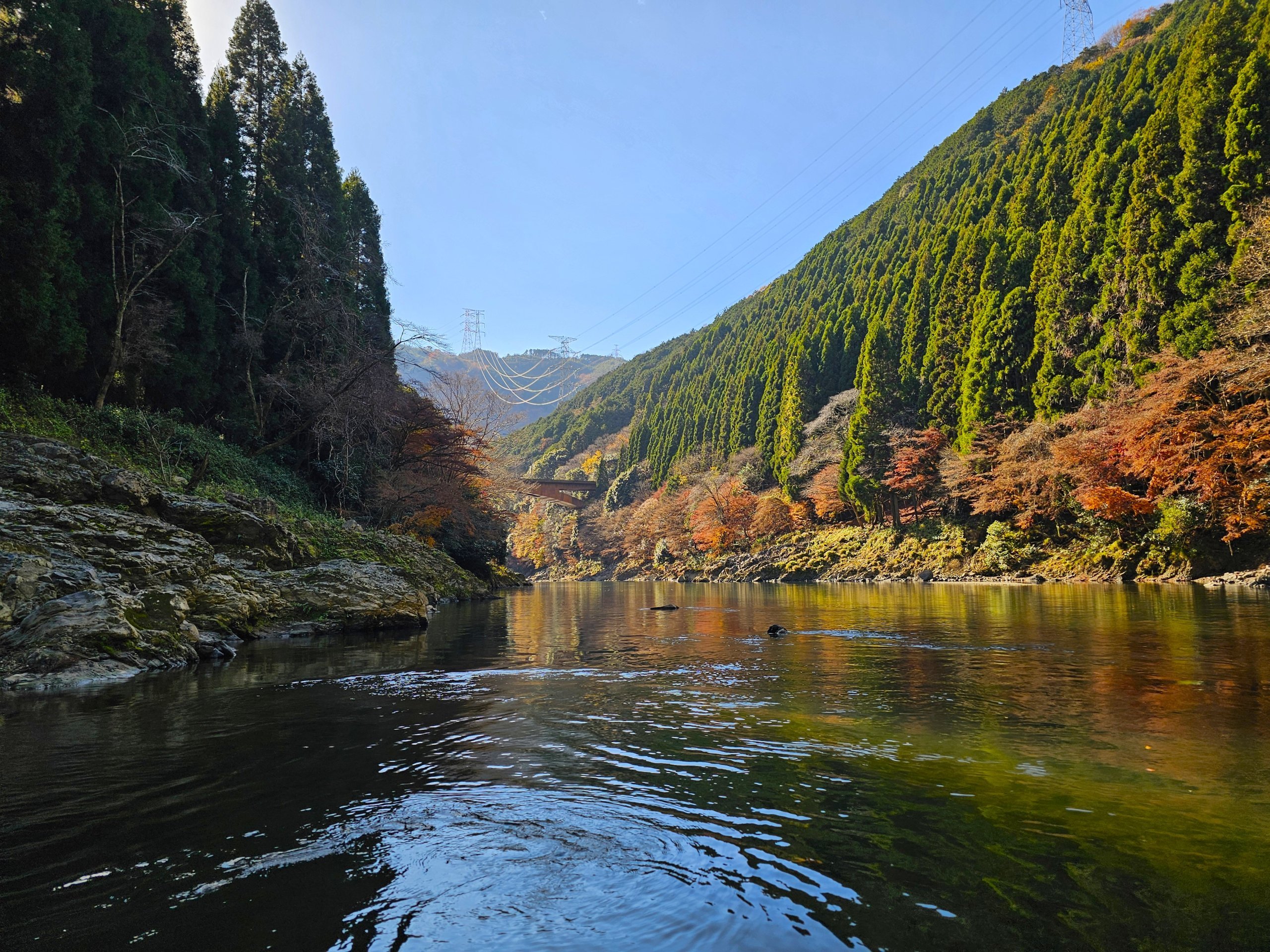 Di antara jeram-jeram tersebut, airnya sangat tenang, sehingga kita bisa menikmati pemandangan musim gugur yang indah.