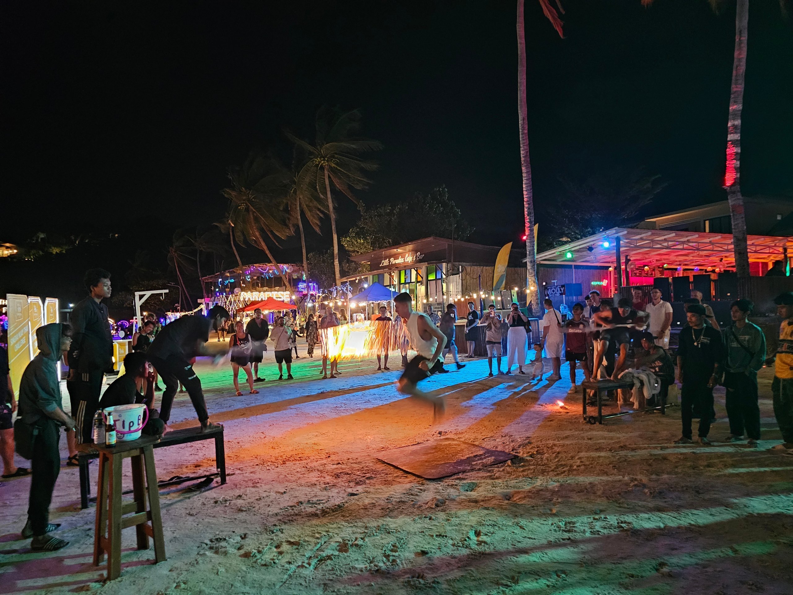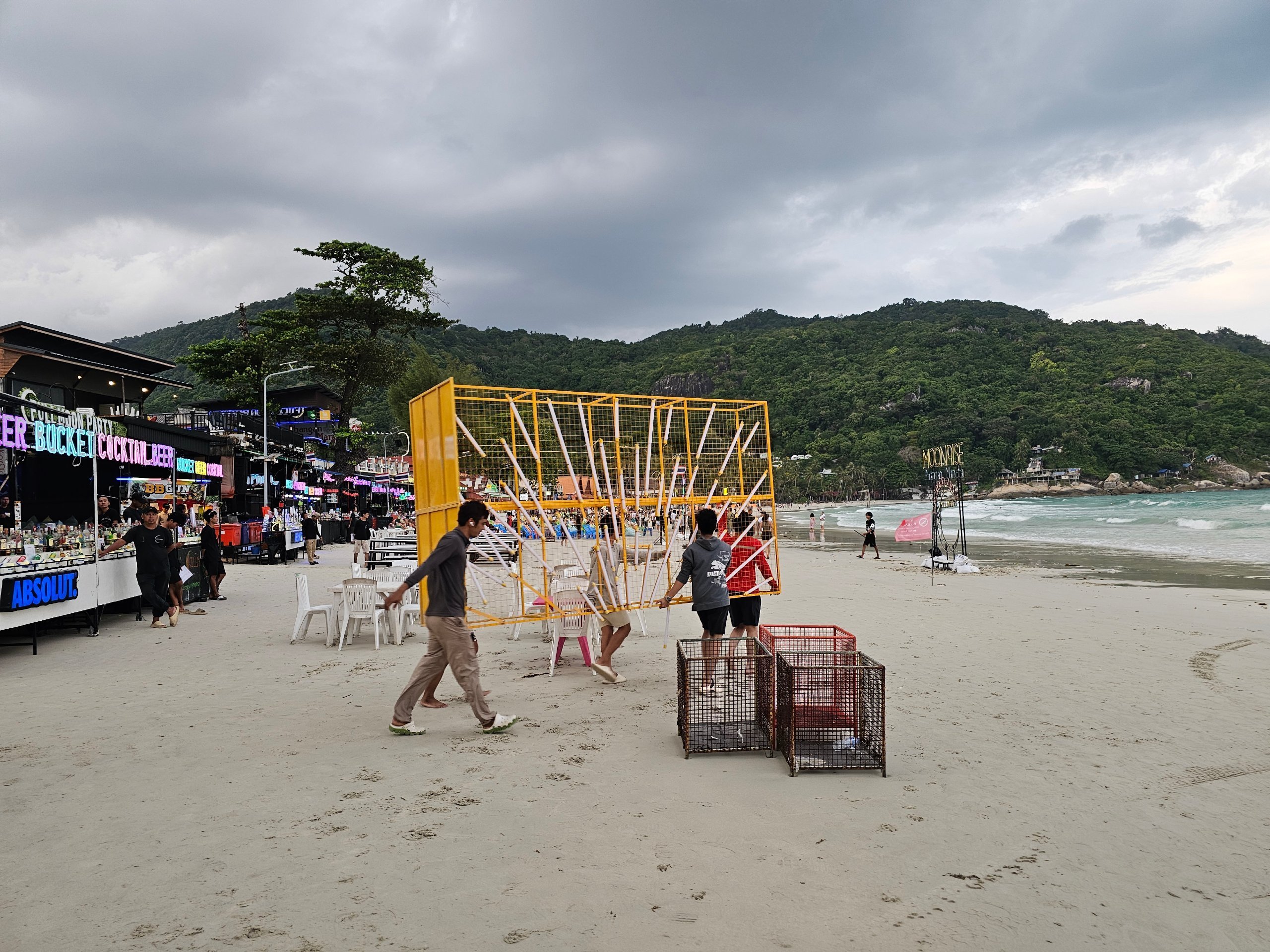 Kunjungan pertama kami ke pantai Haad Rin adalah pada sore hari, ketika persiapan masih berlangsung.