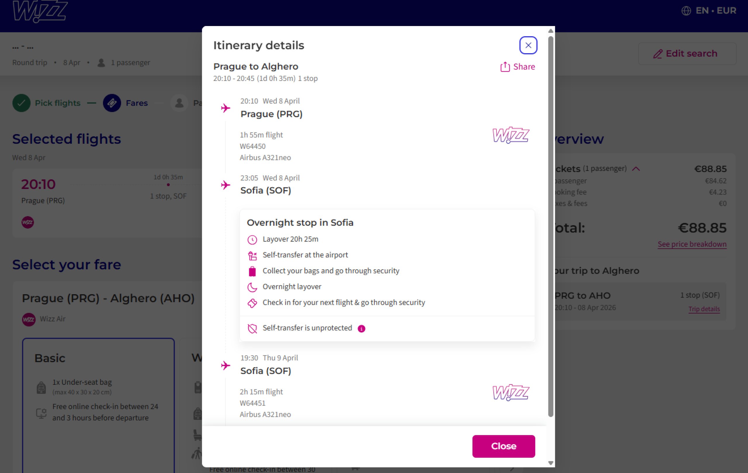 - ❌ jaminan transfer itu sendiri - jika penerbangan pertama ditunda atau dibatalkan, Wizz Air tidak akan memberikan pengembalian uang untuk penerbangan kedua