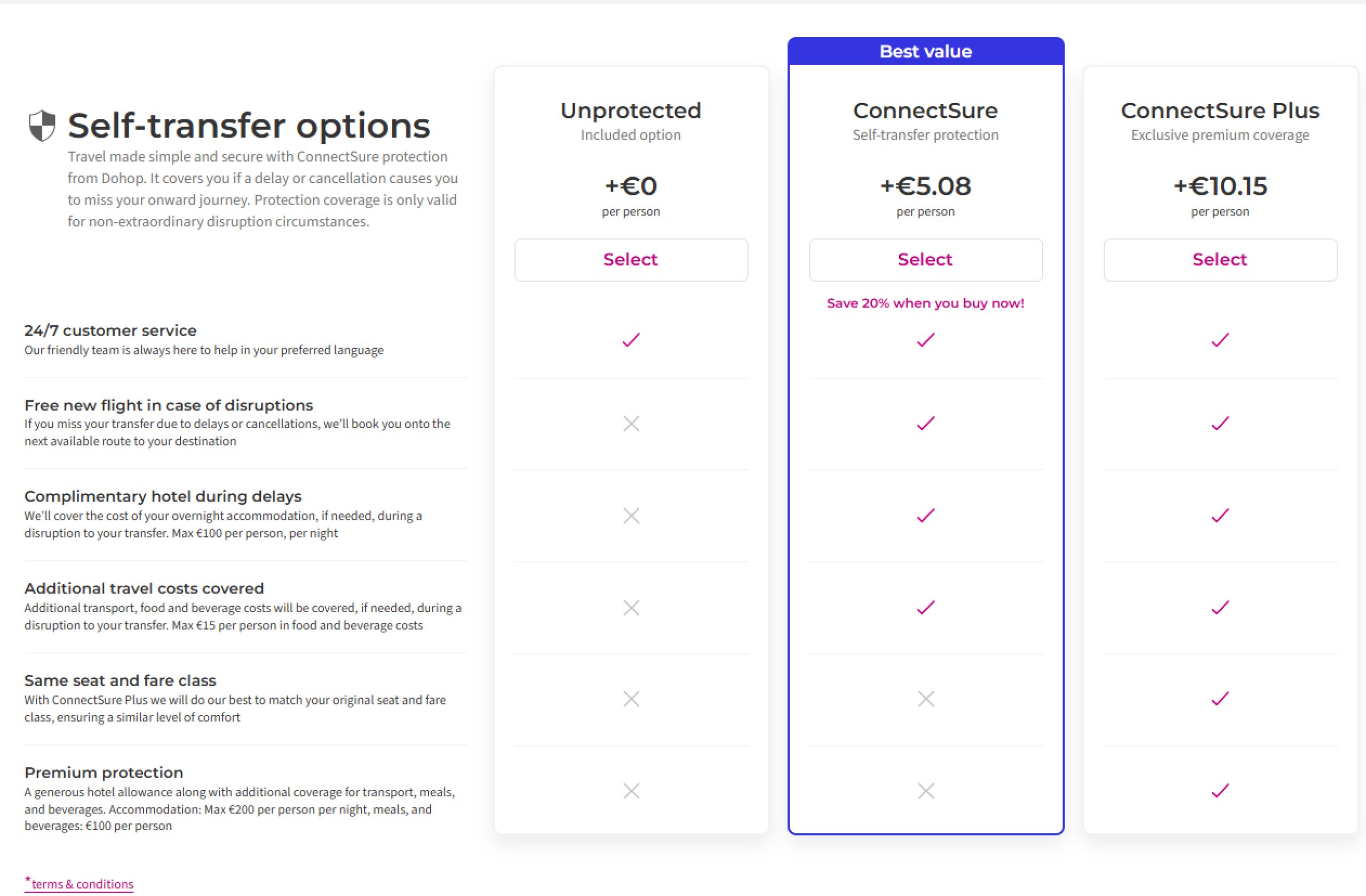 Jika Anda ingin mendapatkan jaminan penerbangan lanjutan, Anda juga harus membeli ConnectSure bersama dengan tiket Anda, yang dipilih selama proses pemesanan penerbangan.