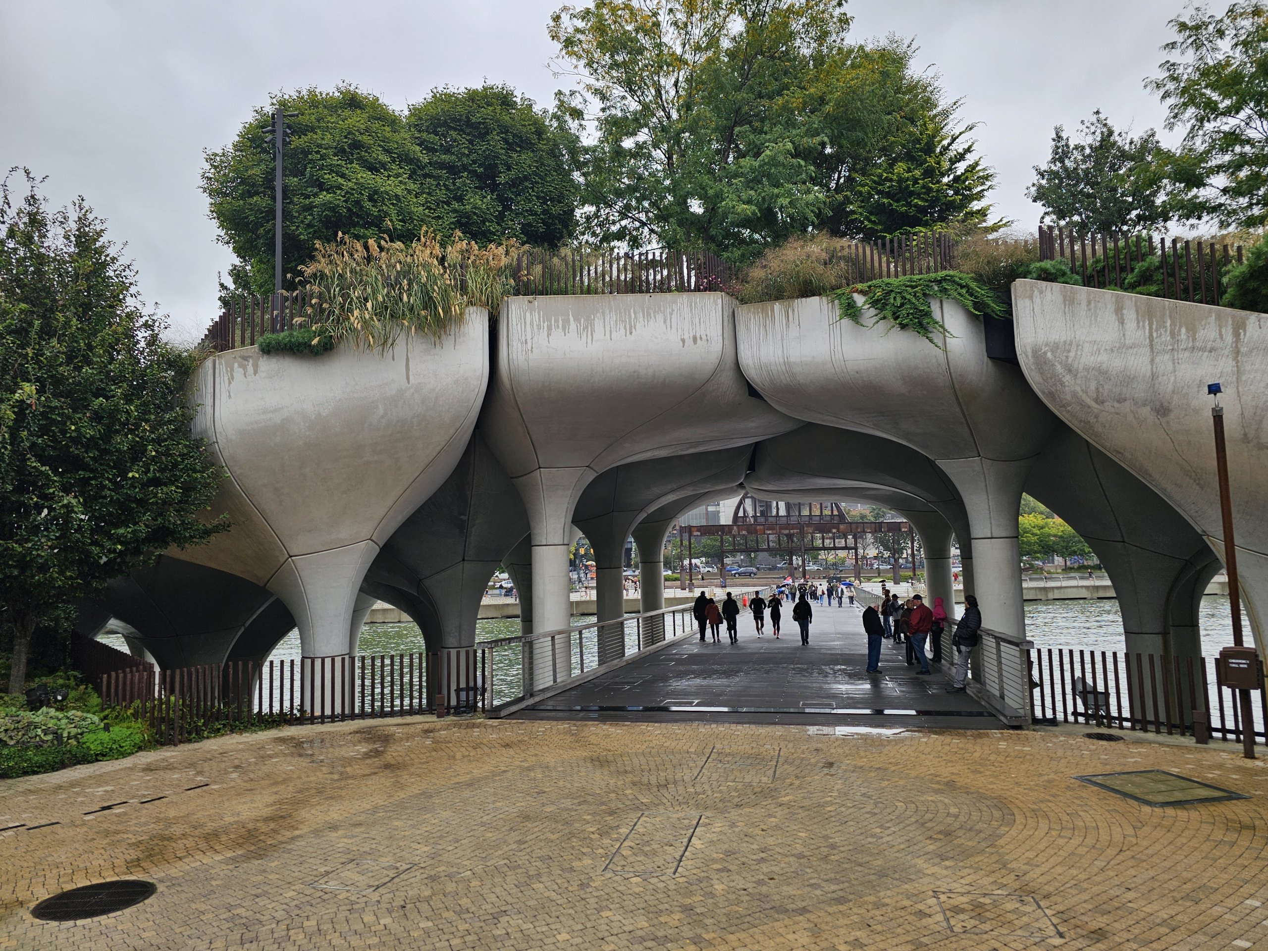 Little Island terhubung ke daratan utama dengan dua jembatan penyeberangan pendek dan terletak di 13th dan 14th Street.