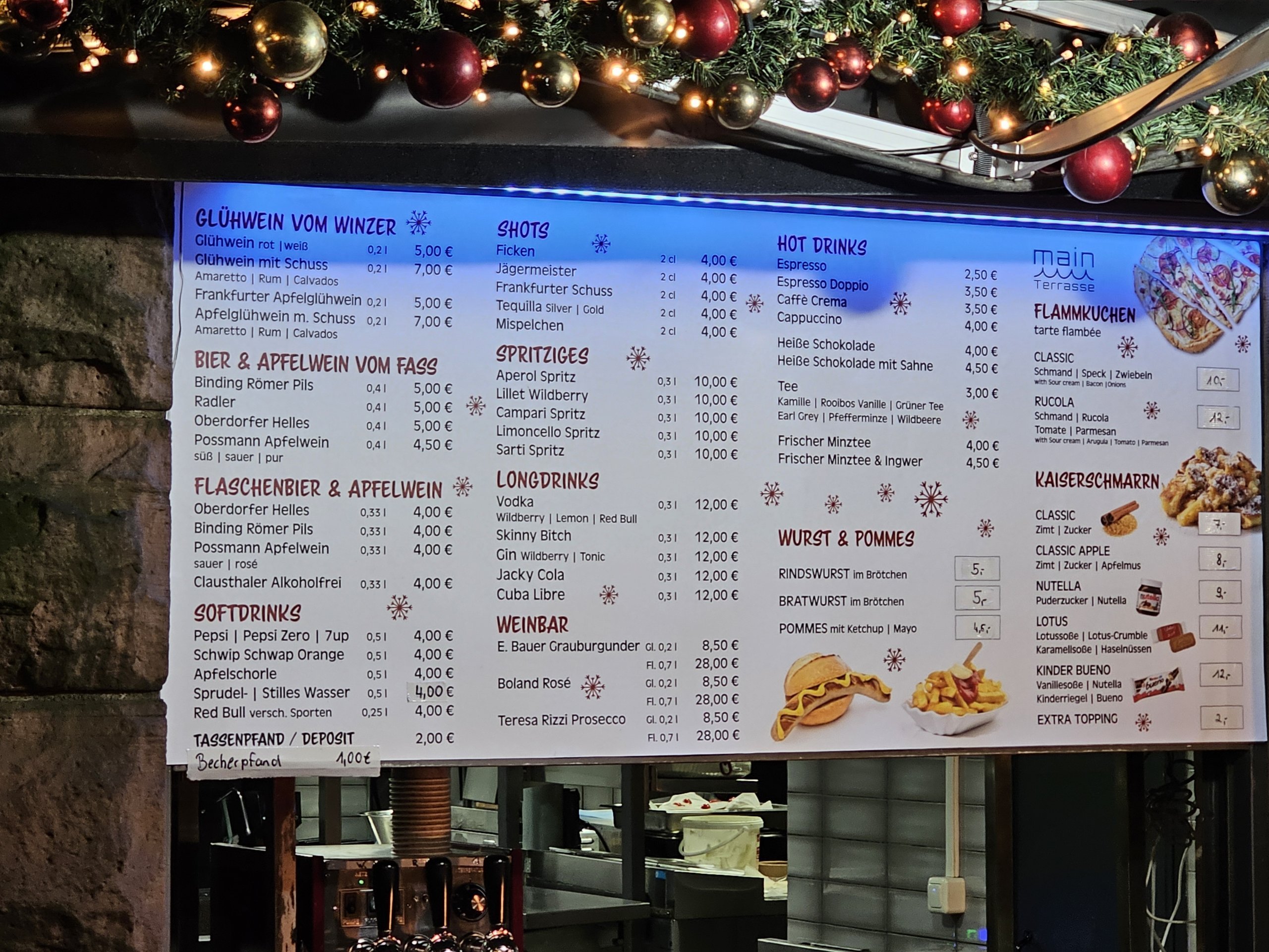 Beberapa kios yang lebih besar juga menerima pembayaran dengan kartu, tetapi jumlahnya sangat sedikit, jadi uang tunai adalah suatu keharusan saat mengunjungi Pasar Natal Frankfurt!