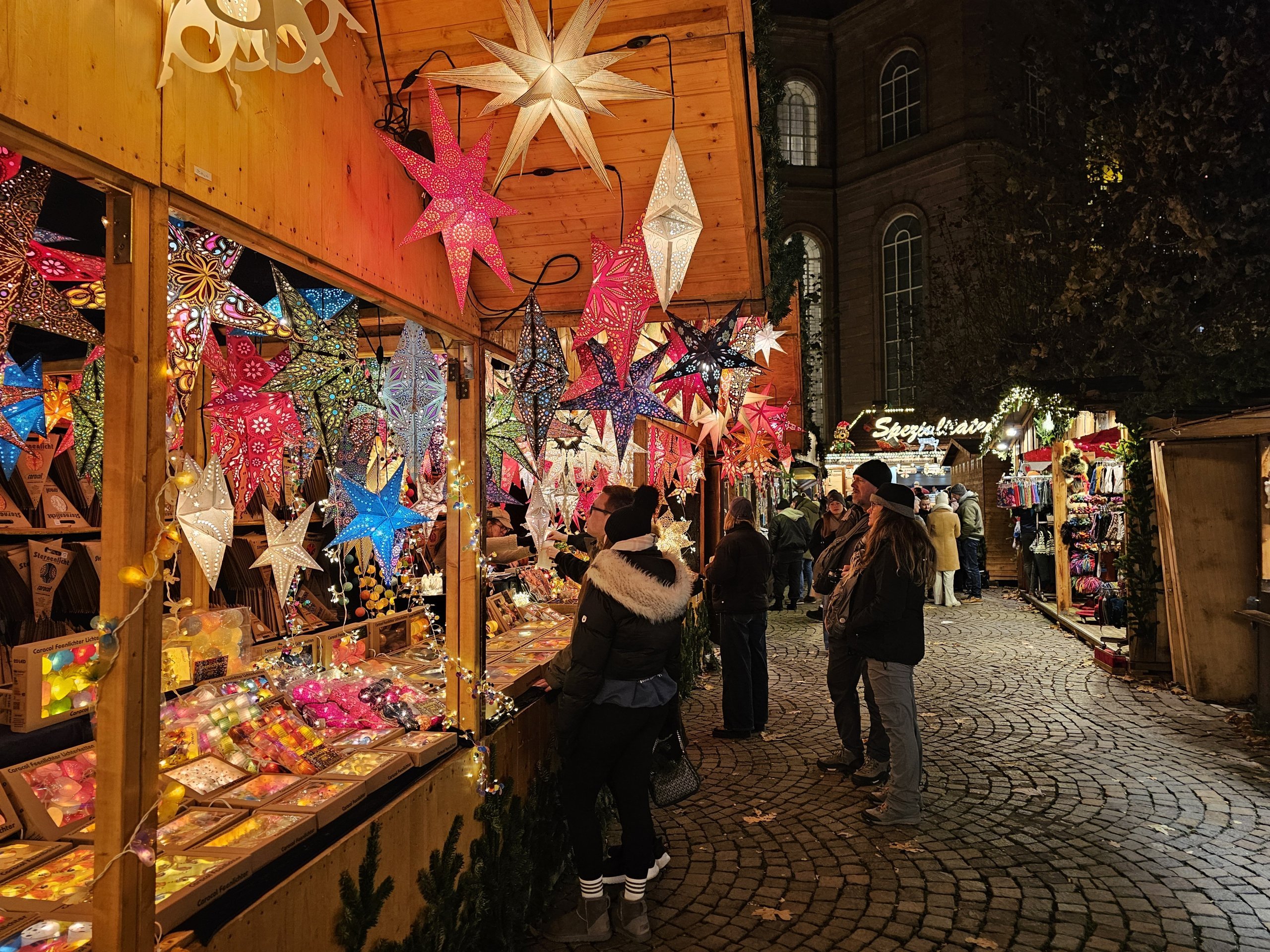 Hanya beberapa langkah dari Römerberg di depan Paulskirche, pasar Natal berlanjut dengan lebih banyak kios dan suasana yang sama sekali berbeda.