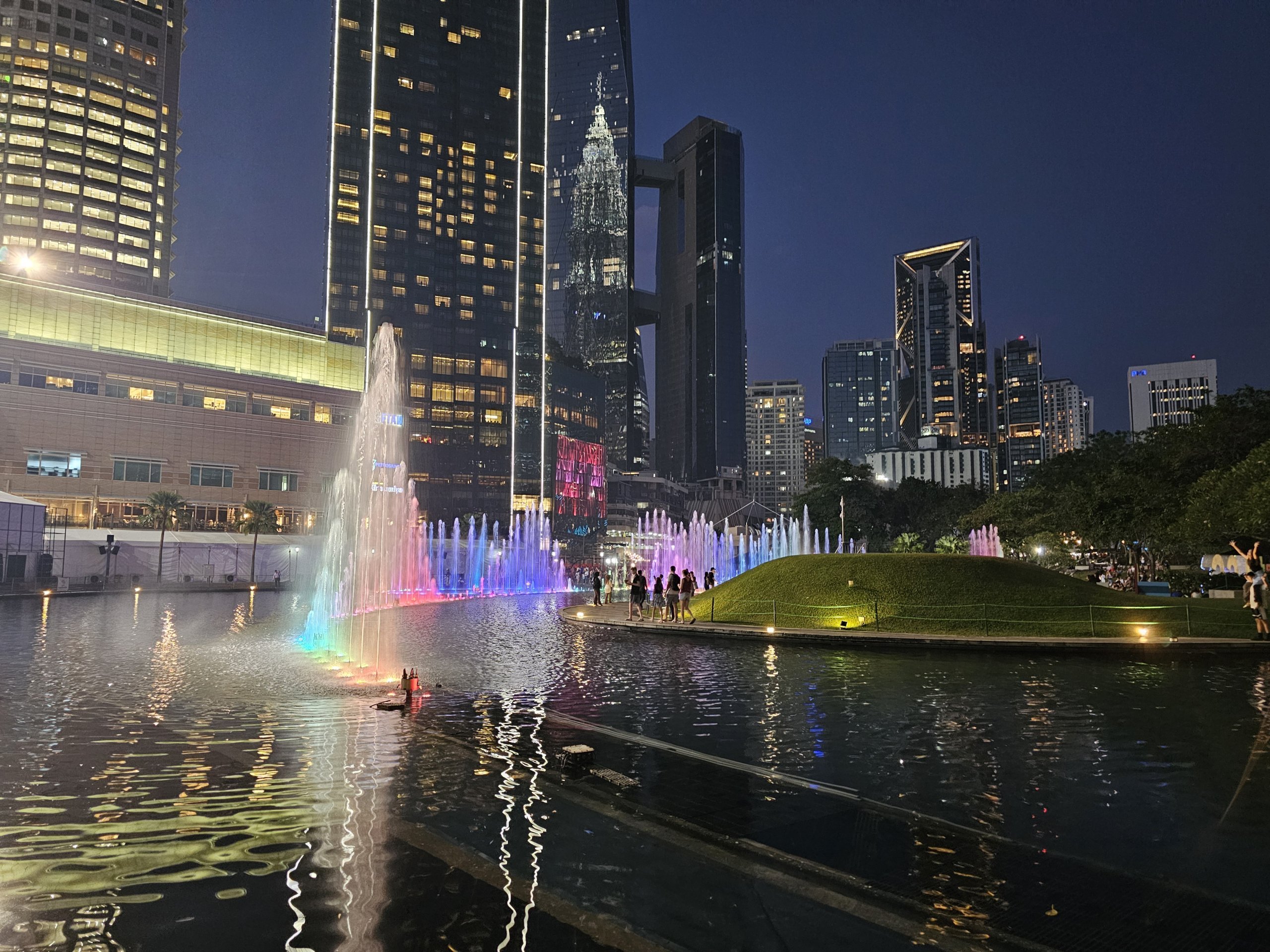 Setiap malam, sebuah pertunjukan diiringi musik dari air mancur bercahaya yang berada tepat di bawah Suria Shopping Centre dan Menara Petronas.