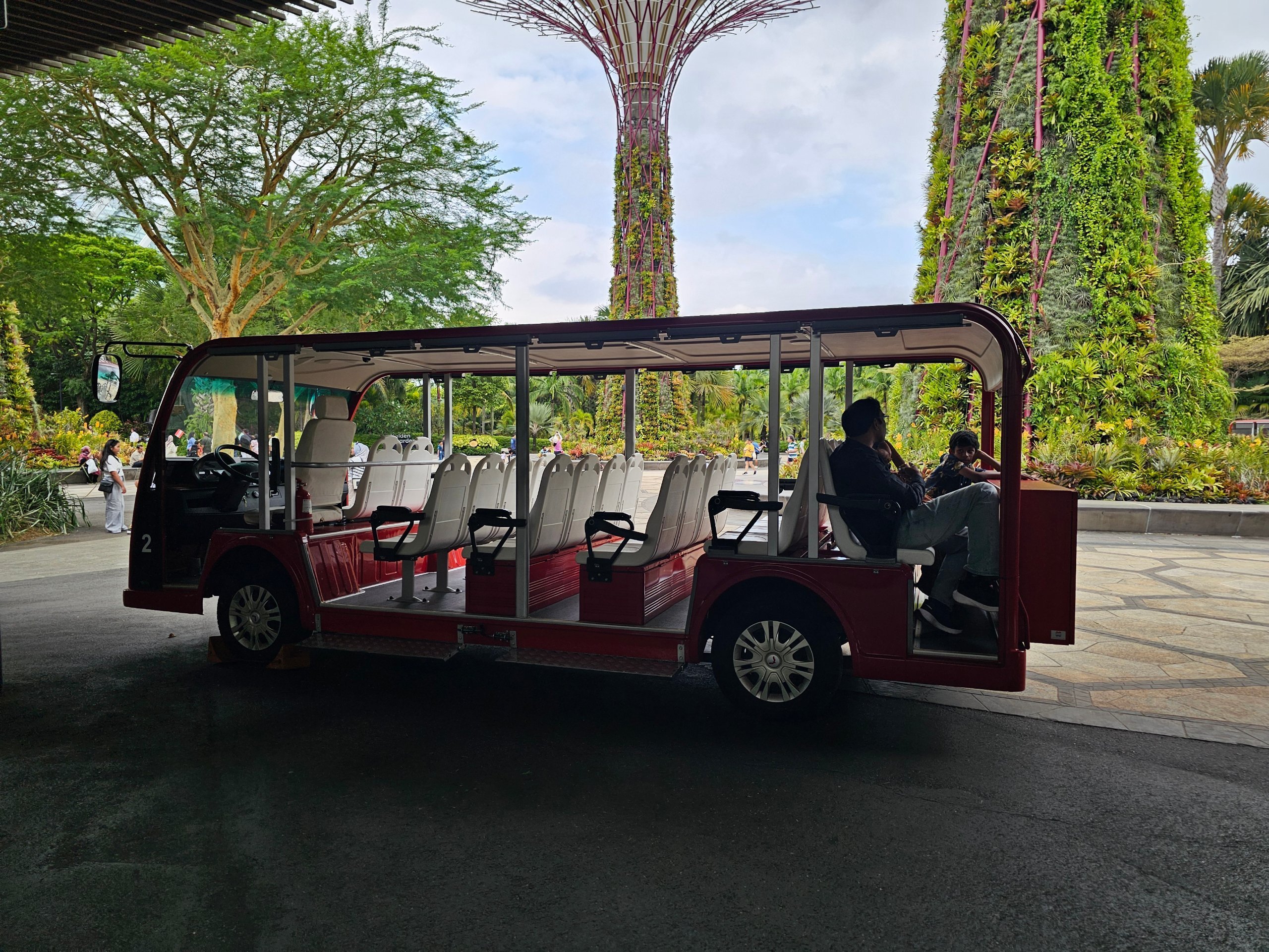 Dari pintu masuk utama, yang berada di sebelah selatan (berseberangan dengan hotel Marina Bay Sands), Anda juga dapat membayar tur troli elektrik seharga 10 SGD. Tersedia pula loker di pintu masuk untuk penyimpanan bagasi.