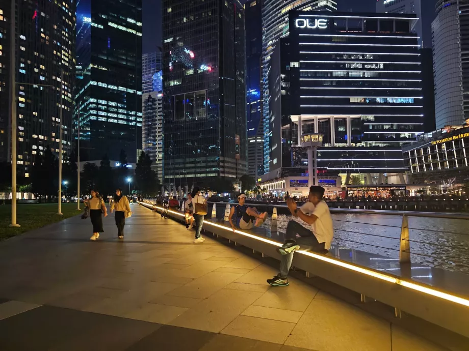 Keindahannya dipamerkan terutama dalam pencahayaan malam hari dari gedung-gedung pencakar langit, Marina Bay Sands Hotel, yang memiliki kolam renang terkenal di dunia di atapnya, bianglala, dan patung-patung singa di sepanjang teluk.