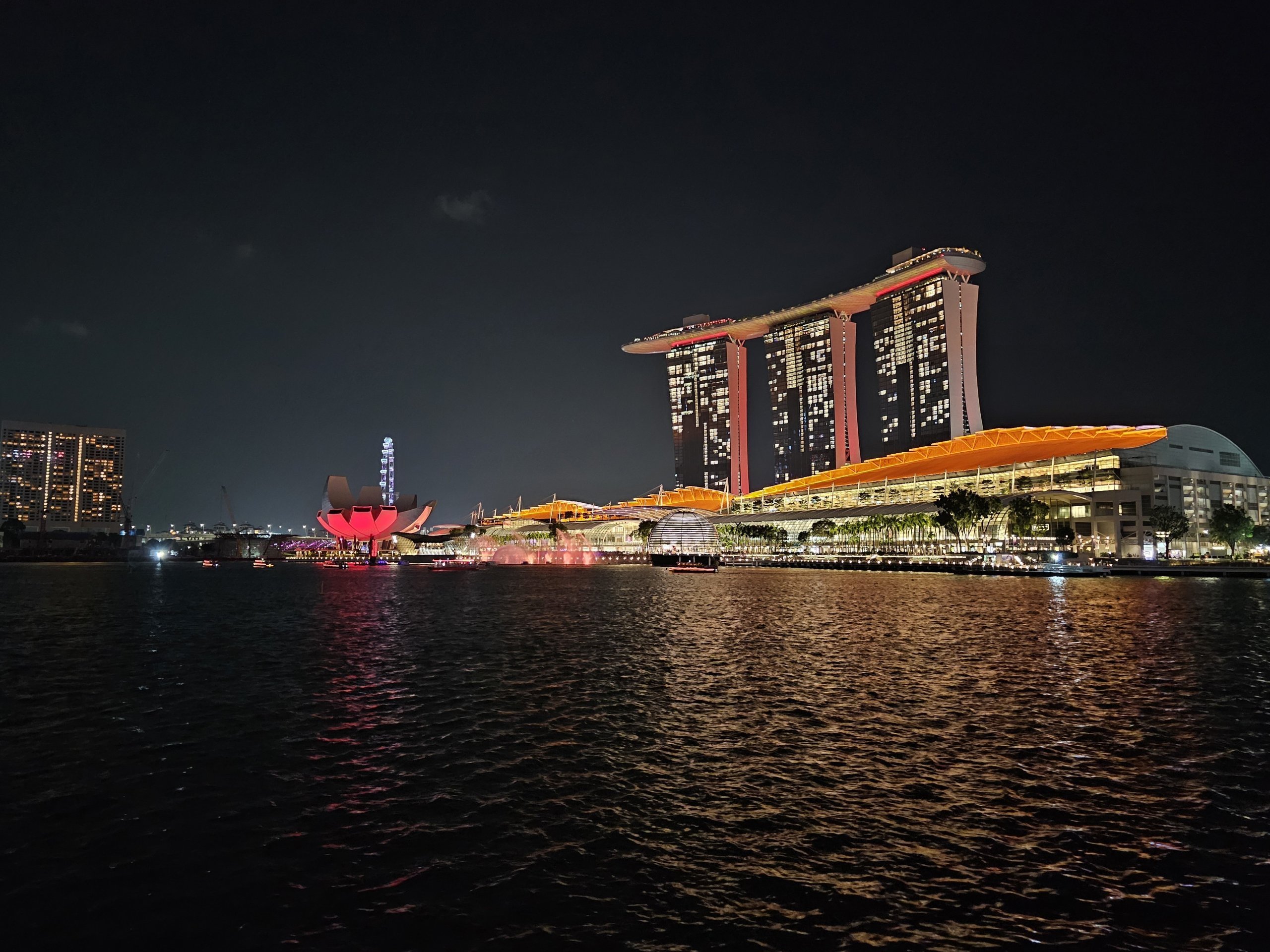 Kami tidak ingin berada tepat di bawah Marina Bay Sands - Anda mendapatkan pertunjukan terdekat, tetapi menurut saya itu lebih banyak kerugiannya - Anda tidak dapat melihat panorama secara keseluruhan.