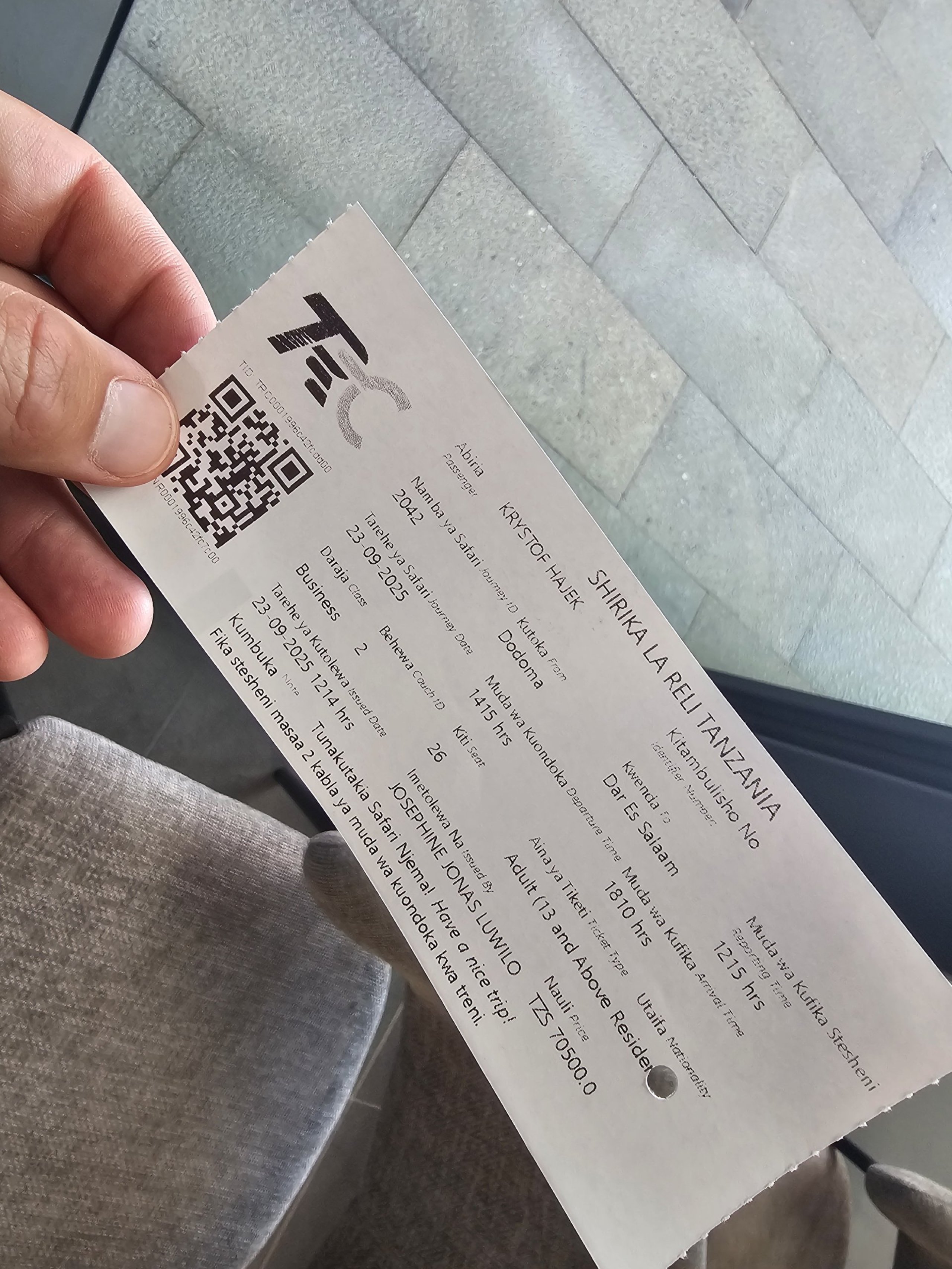 Tiket untuk kereta SGR modern juga dapat dibeli melalui pihak ketiga seperti 12go.asia, yang sering kami gunakan saat bepergian di Asia. Namun, cara ini sama sekali tidak berfungsi dengan baik di Tanzania. Situs web ini mengatur tiket kereta api melalui perantara lokal, tetapi bahkan setelah beberapa kali didesak, dia tidak mengirimkan tiket dan saya harus membeli tiket baru di stasiun.