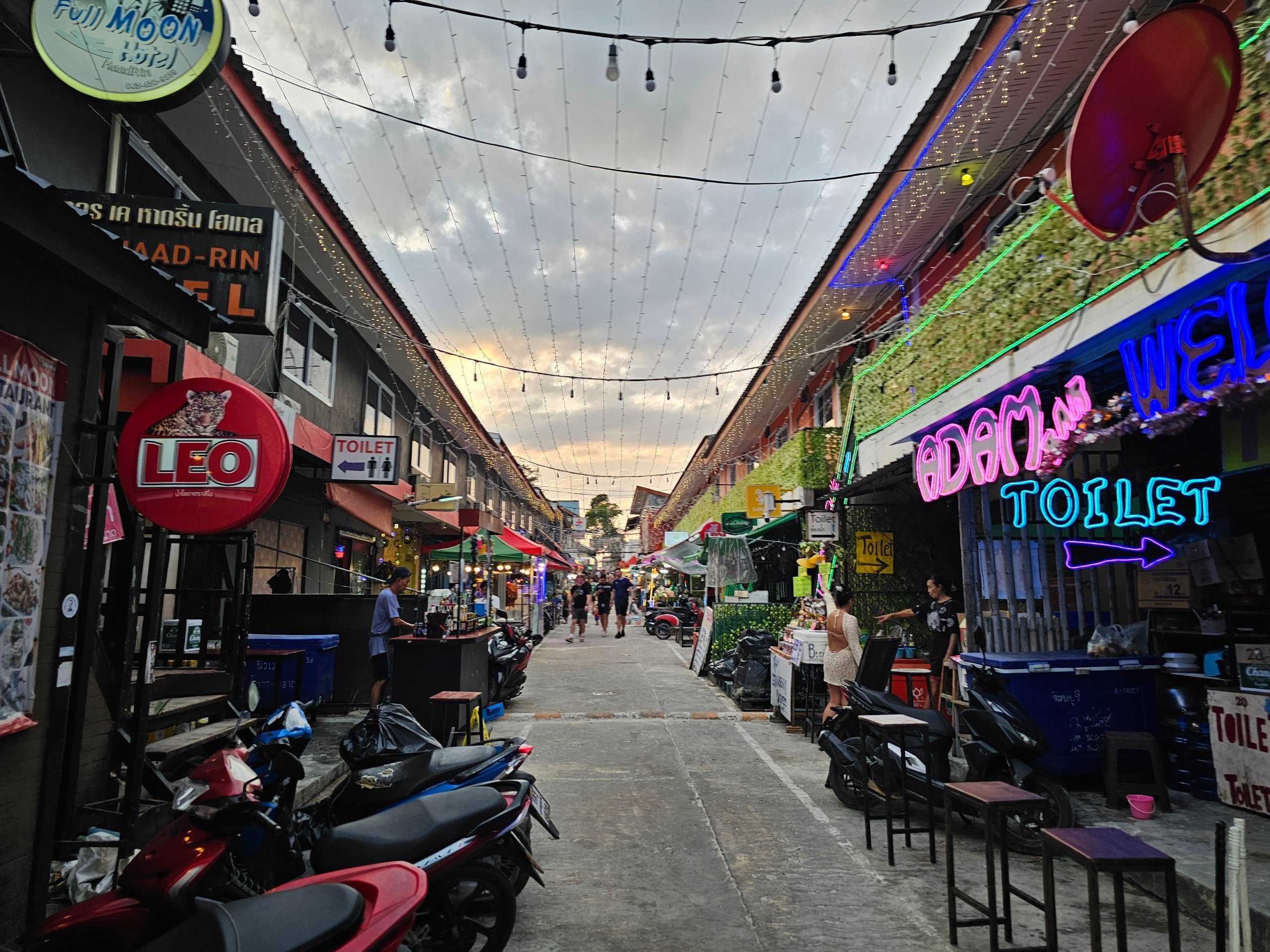 Haad Rin Walking Street paling ramai saat Pesta Bulan Purnama, tetapi di luar itu, tempat ini tetap buka.
