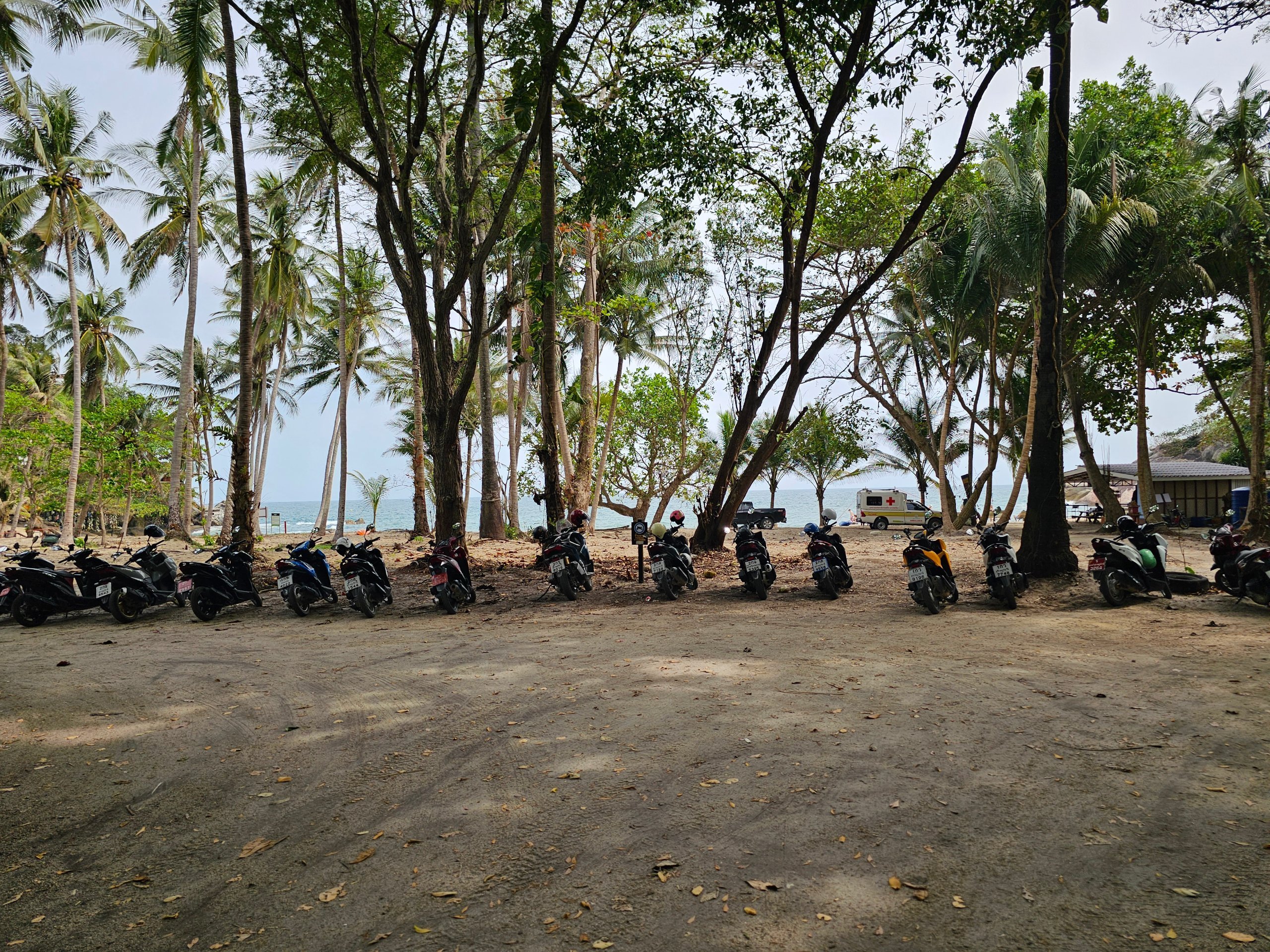 Parkir gratis untuk skuter dan mobil tersedia di tepi pantai.