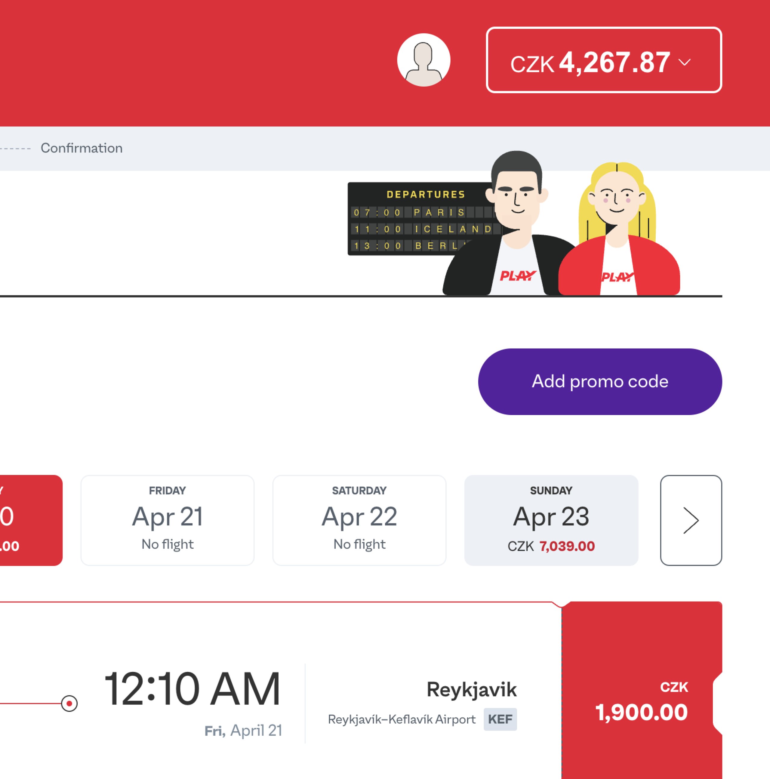 Apakah Anda memiliki kode promo yang valid dan berlaku untuk Play Airlines dan tidak tahu di mana memasukkannya? Pertama, cari penerbangan, pilih tanggal tertentu dari kalender dan lanjutkan ke jadwal penerbangan yang lebih detail.