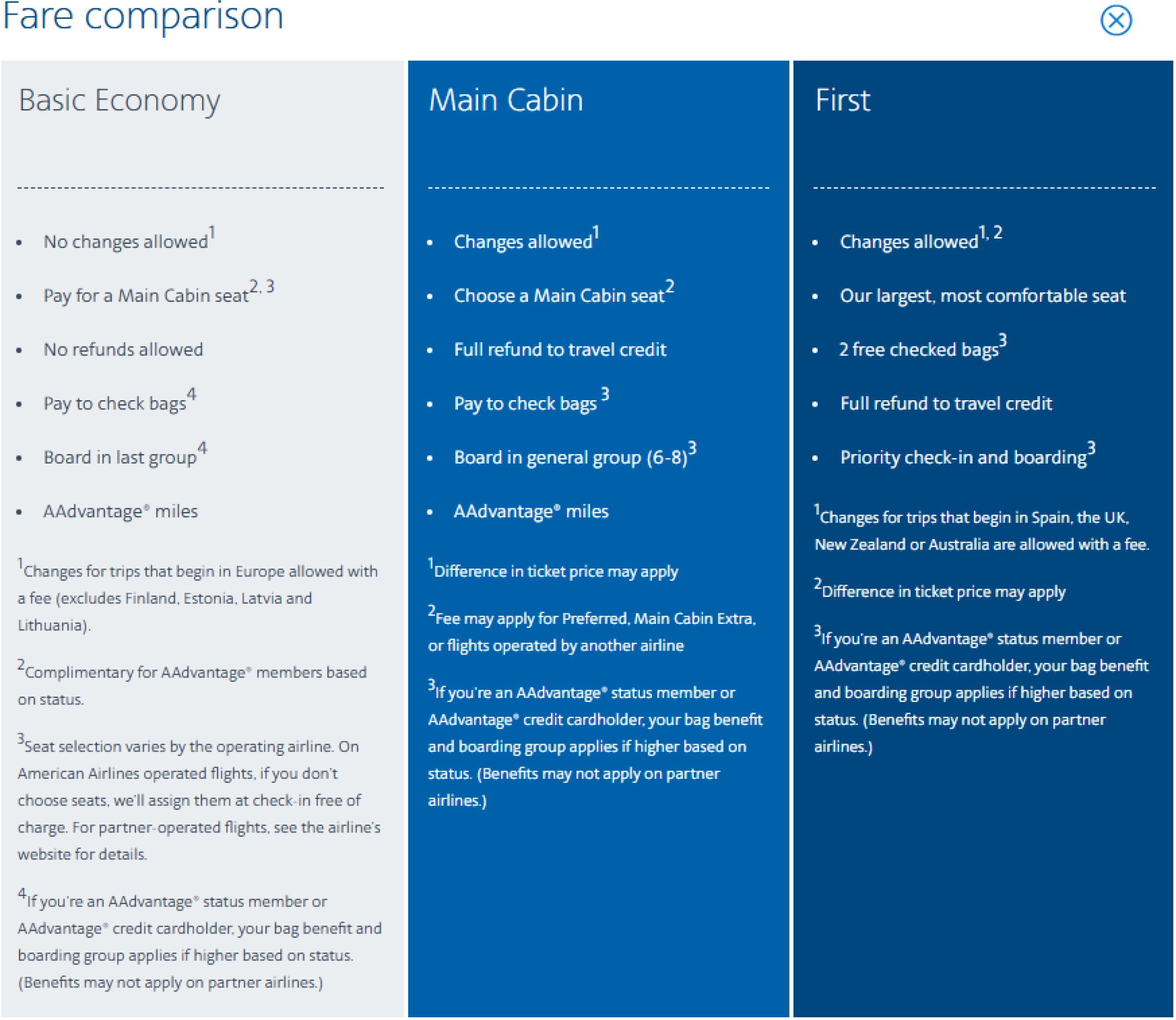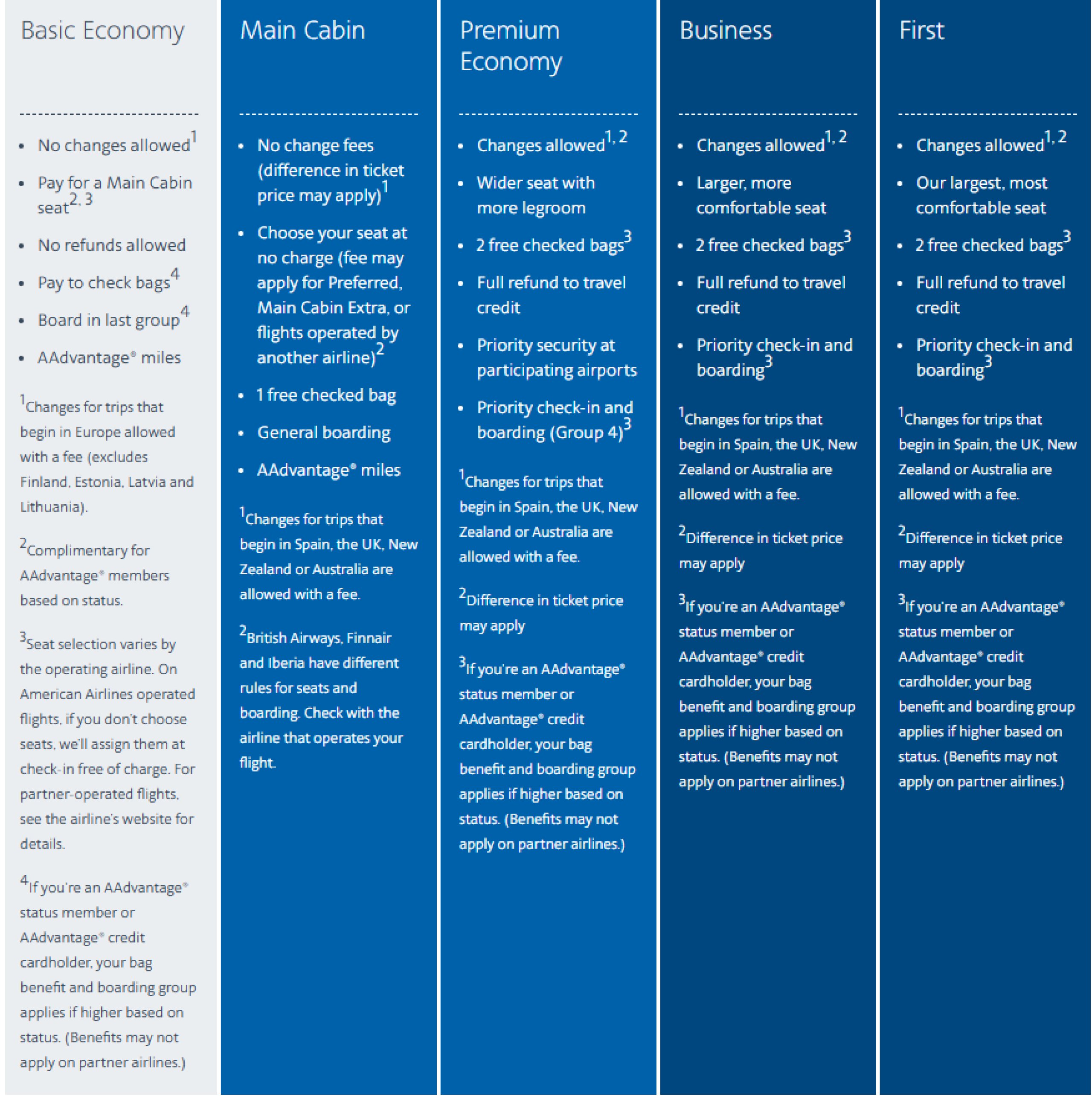 American Airlines menawarkan kelas ekonomi, ekonomi premium, bisnis, dan kelas satu di pesawatnya.