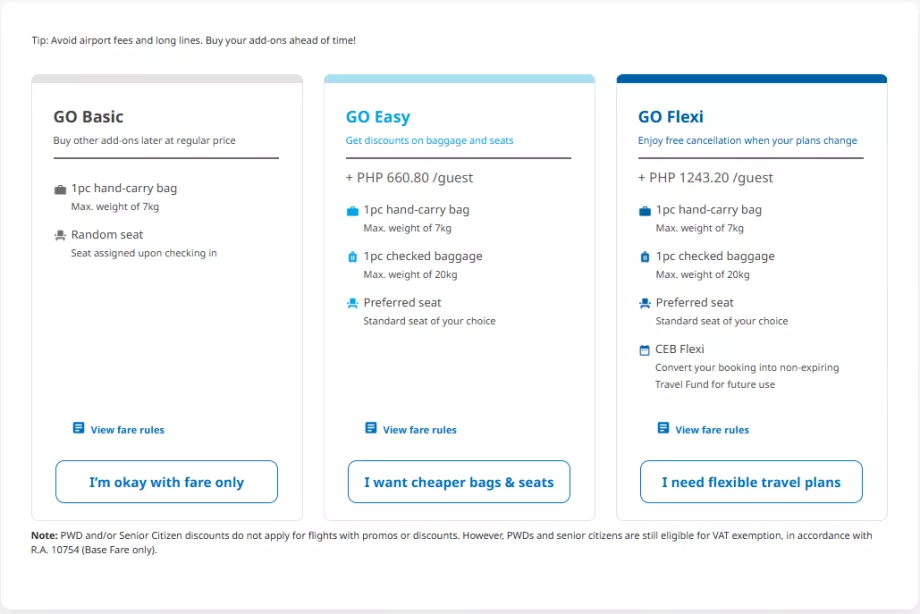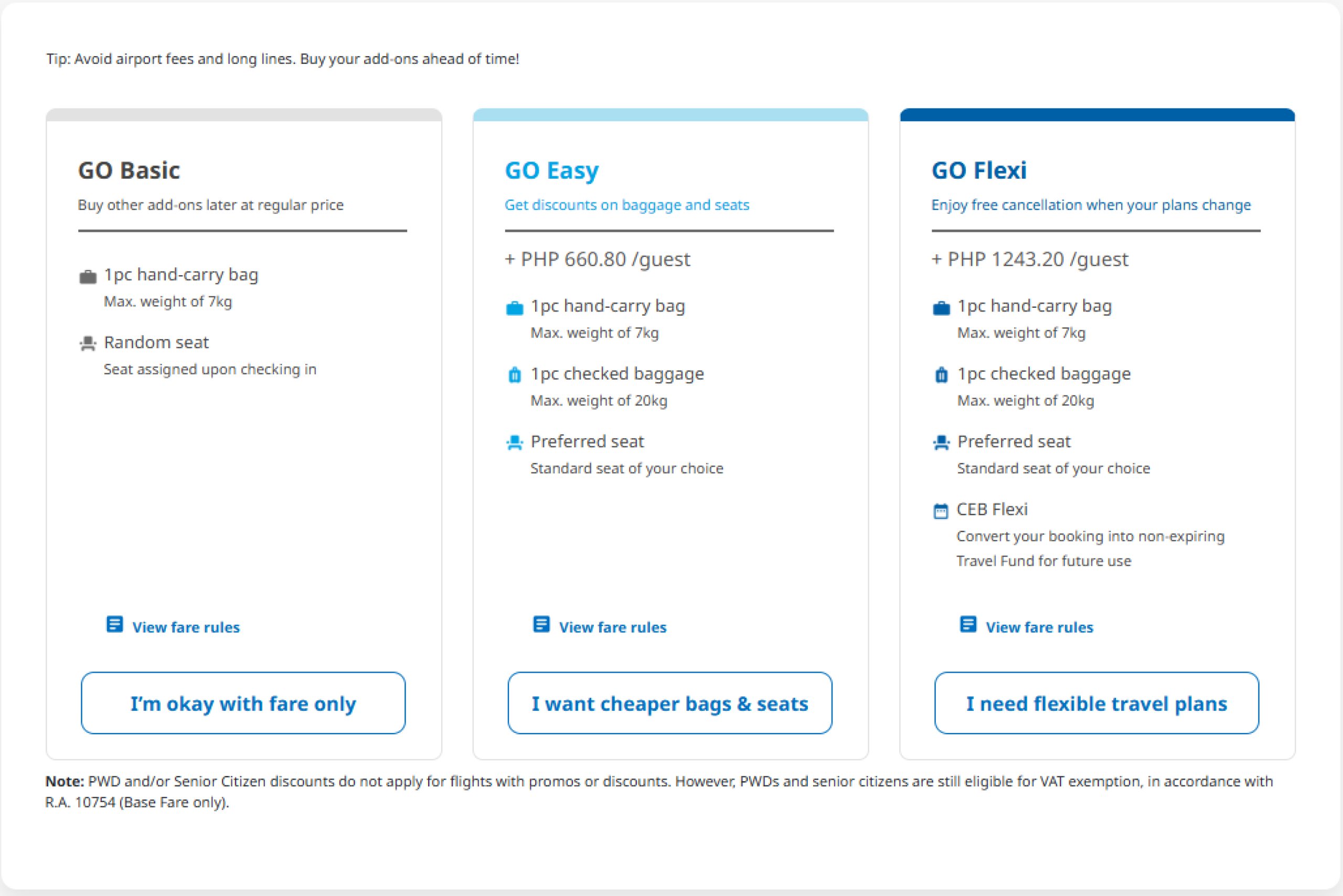 - GO Flexi - Gratis bagasi terdaftar (20 kg) dan bagasi jinjing, gratis pemilihan kursi, gratis pembatalan (uang akan dikembalikan sebagai kredit untuk penggunaan di masa mendatang dengan Cebu Pacific