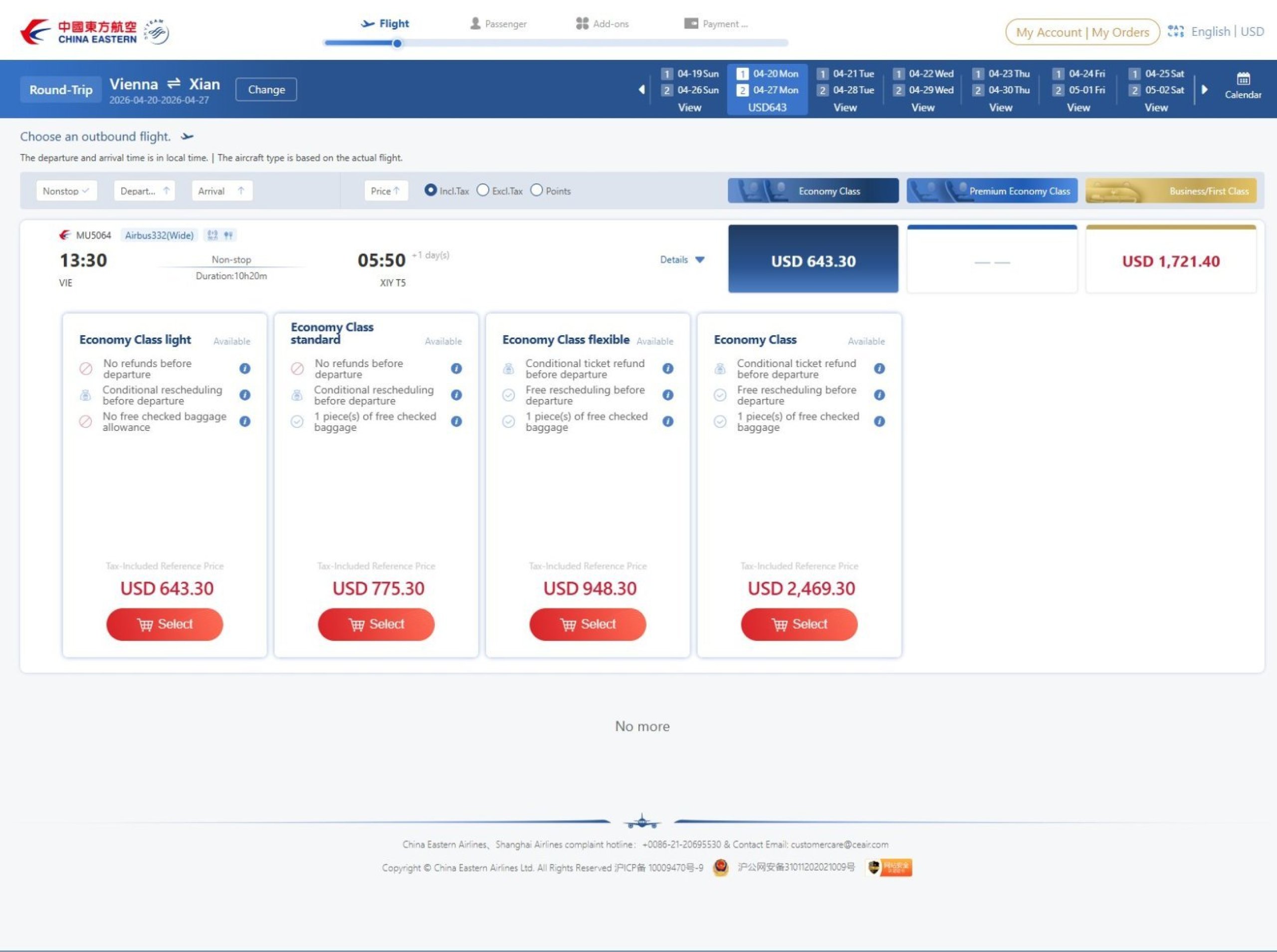 Dan China Eastern akan mulai terbang antara Wina dan Xi'an pada tanggal 20 April.