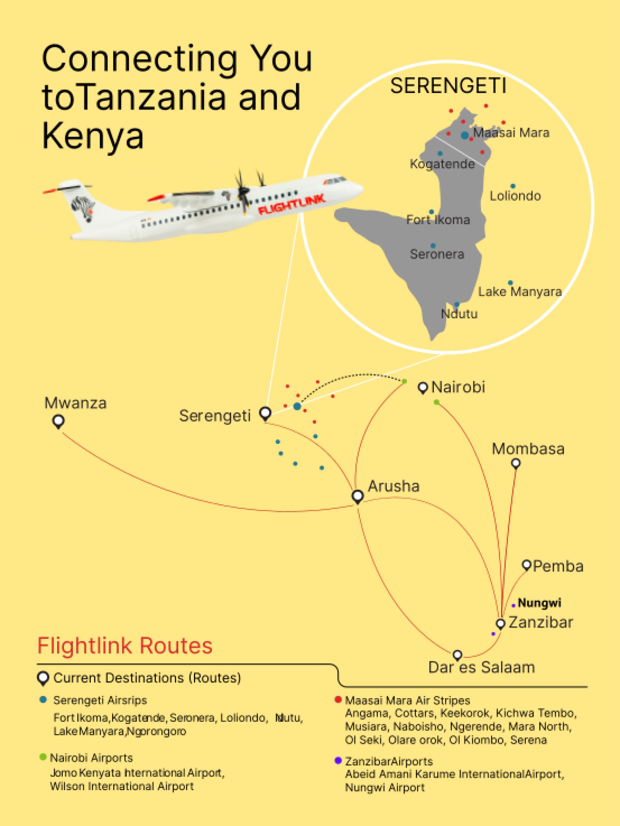 Maskapai ini terutama menghubungkan destinasi-destinasi ini dengan lokasi pendaratan di taman nasional safari dan pulau Zanzibar.
