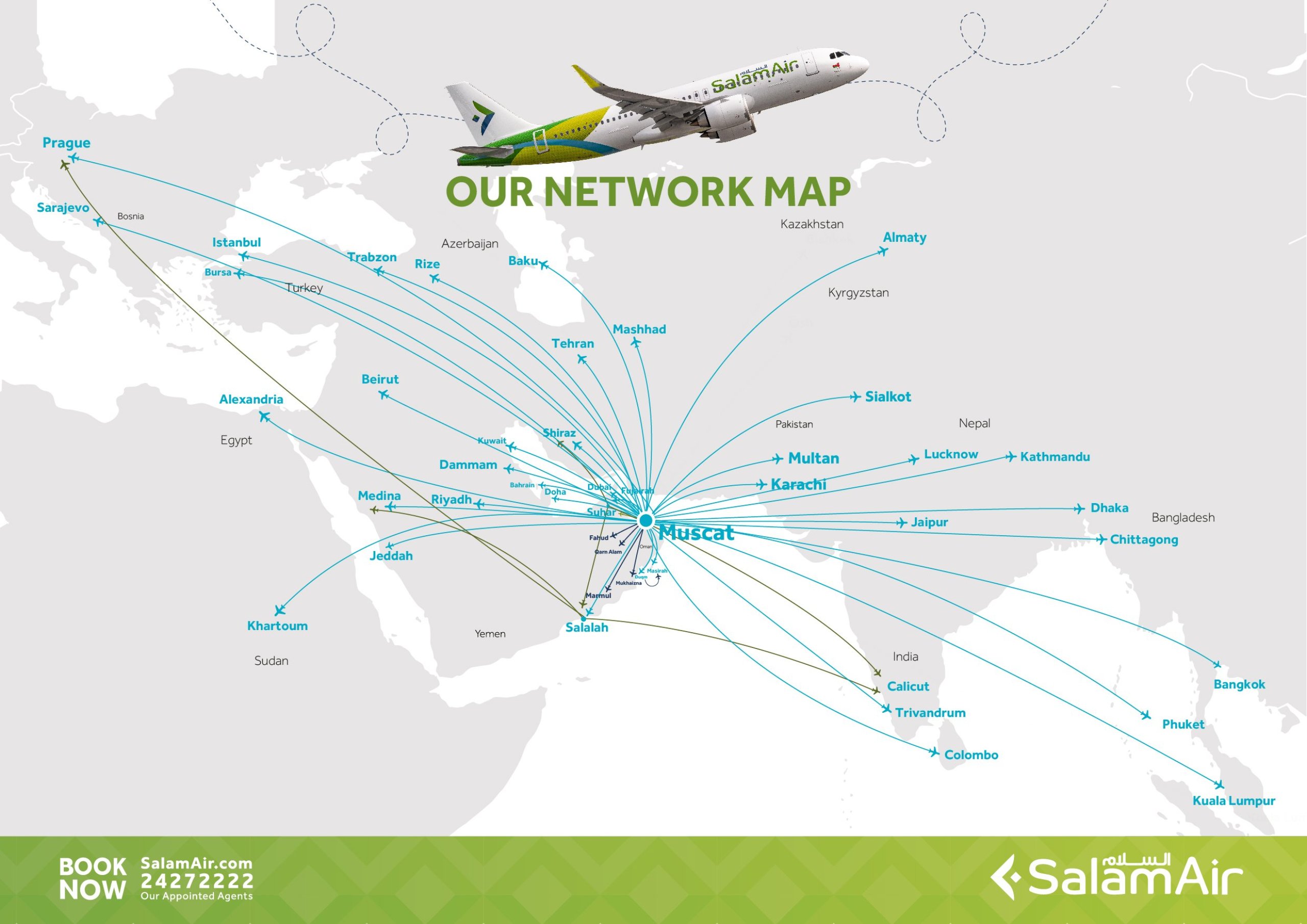 SalamAir mengoperasikan penerbangan terjadwal ke kurang dari selusin tujuan terutama di wilayah Asia Barat Daya dan Asia Tengah. Namun, daftar destinasinya juga mencakup kota-kota di Eropa seperti Praha, Sarajevo dan Istanbul. Destinasi terpenting yang ditawarkan SalamAir adalah sebagai berikut: