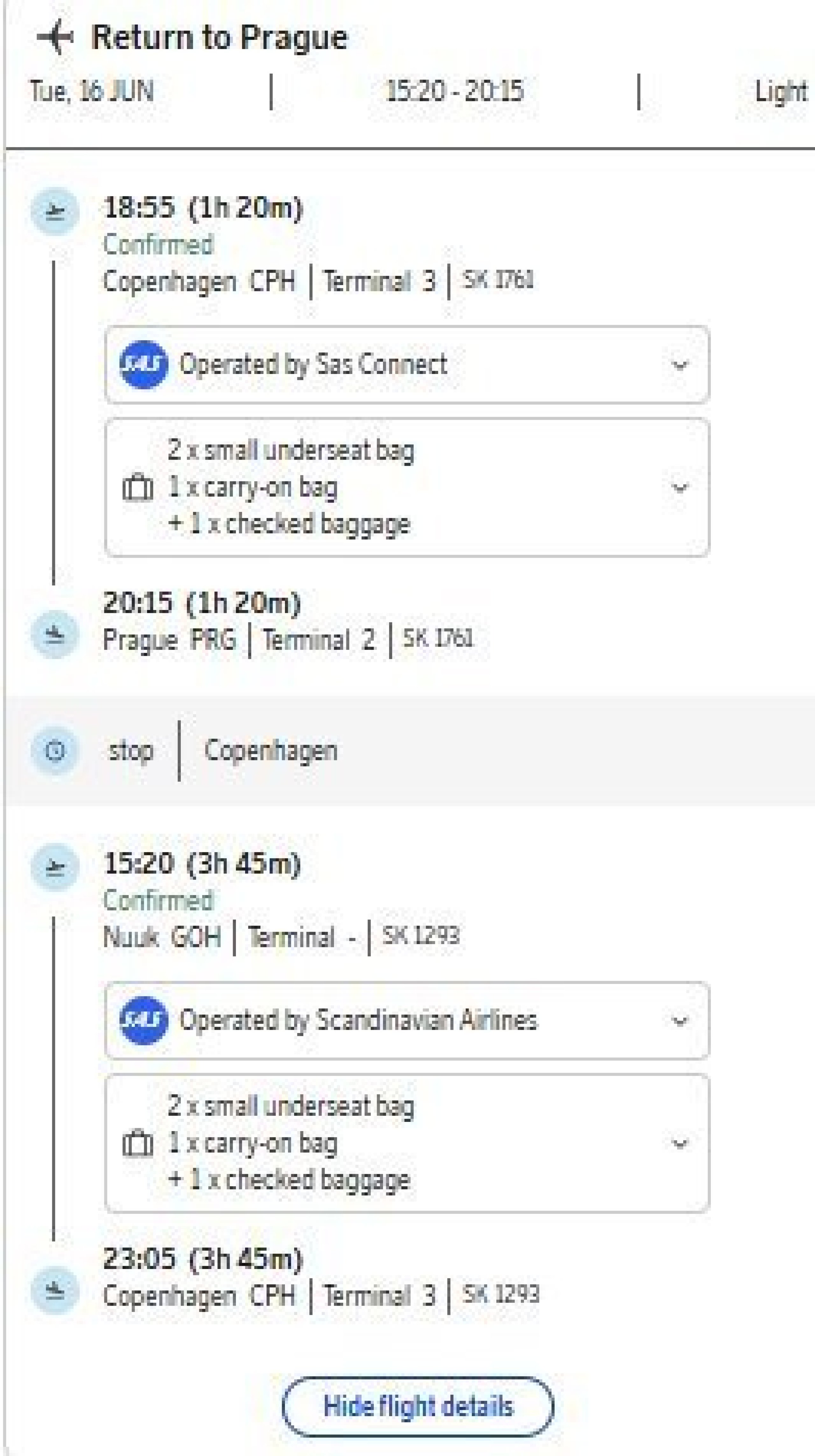 Pada tanggal 16 Juni saat ini ada penerbangan dari GOH ke CPH pada pukul 15.20 dan mendarat pada pukul 23.05, jadi pada hari itu Anda tidak dapat mengejar penerbangan ke Praha karena penerbangan tersebut berangkat pada pukul 18.55.