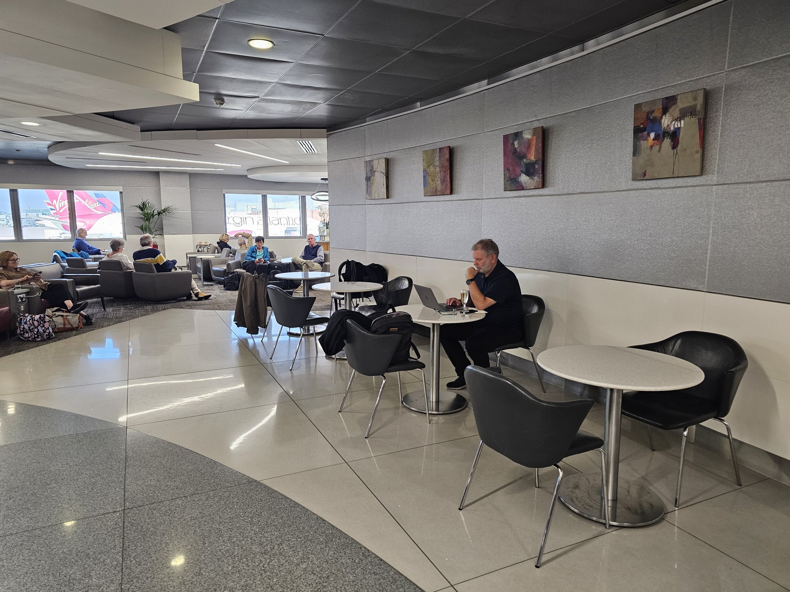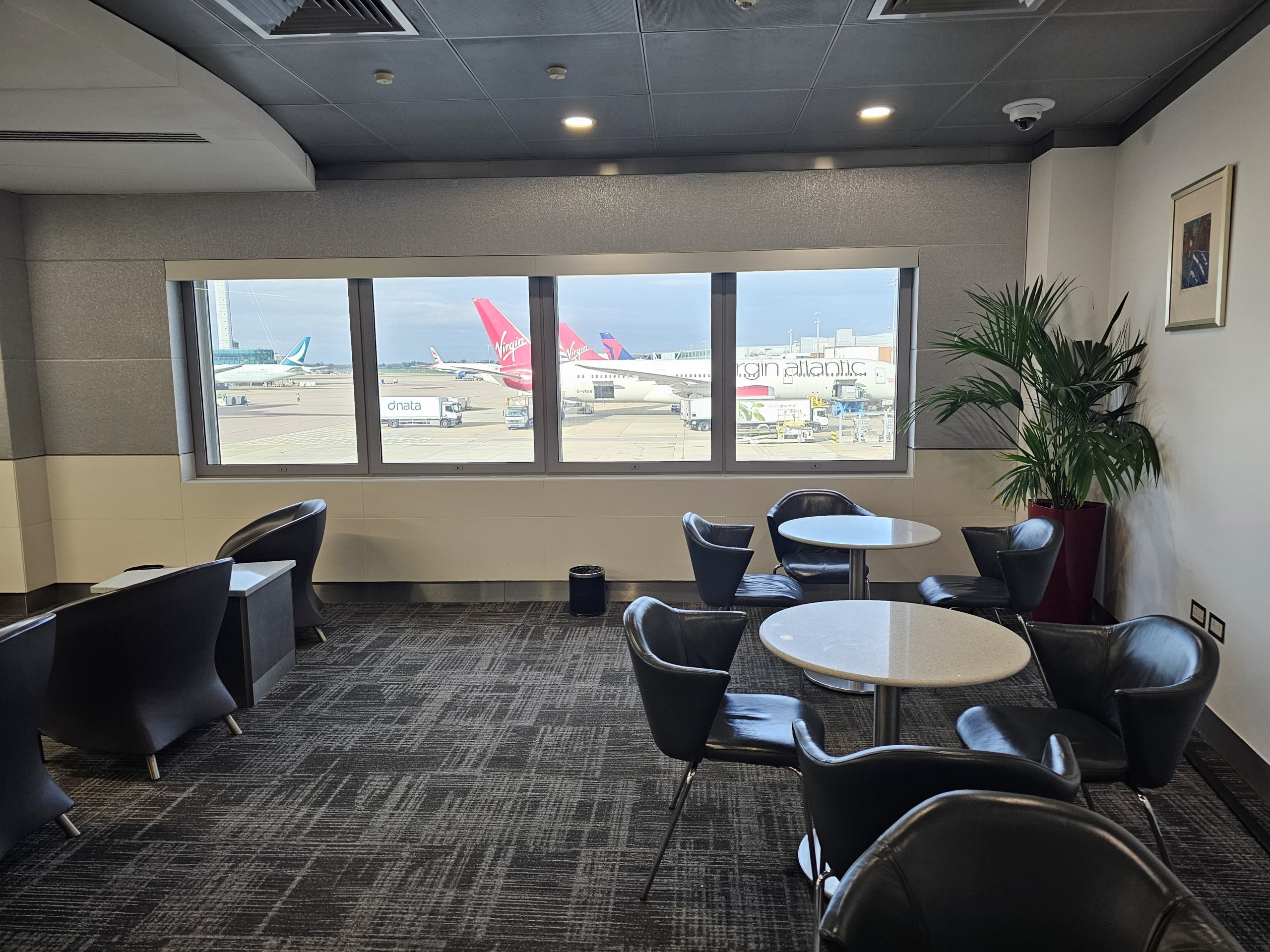 Keuntungan yang luar biasa adalah pemandangan landasan pacu bandara yang luar biasa - terdapat deretan pesawat jarak jauh yang besar tepat di depan lounge, dan Anda juga dapat melihat menara Bandara Heahtrow yang ikonik dari sini.