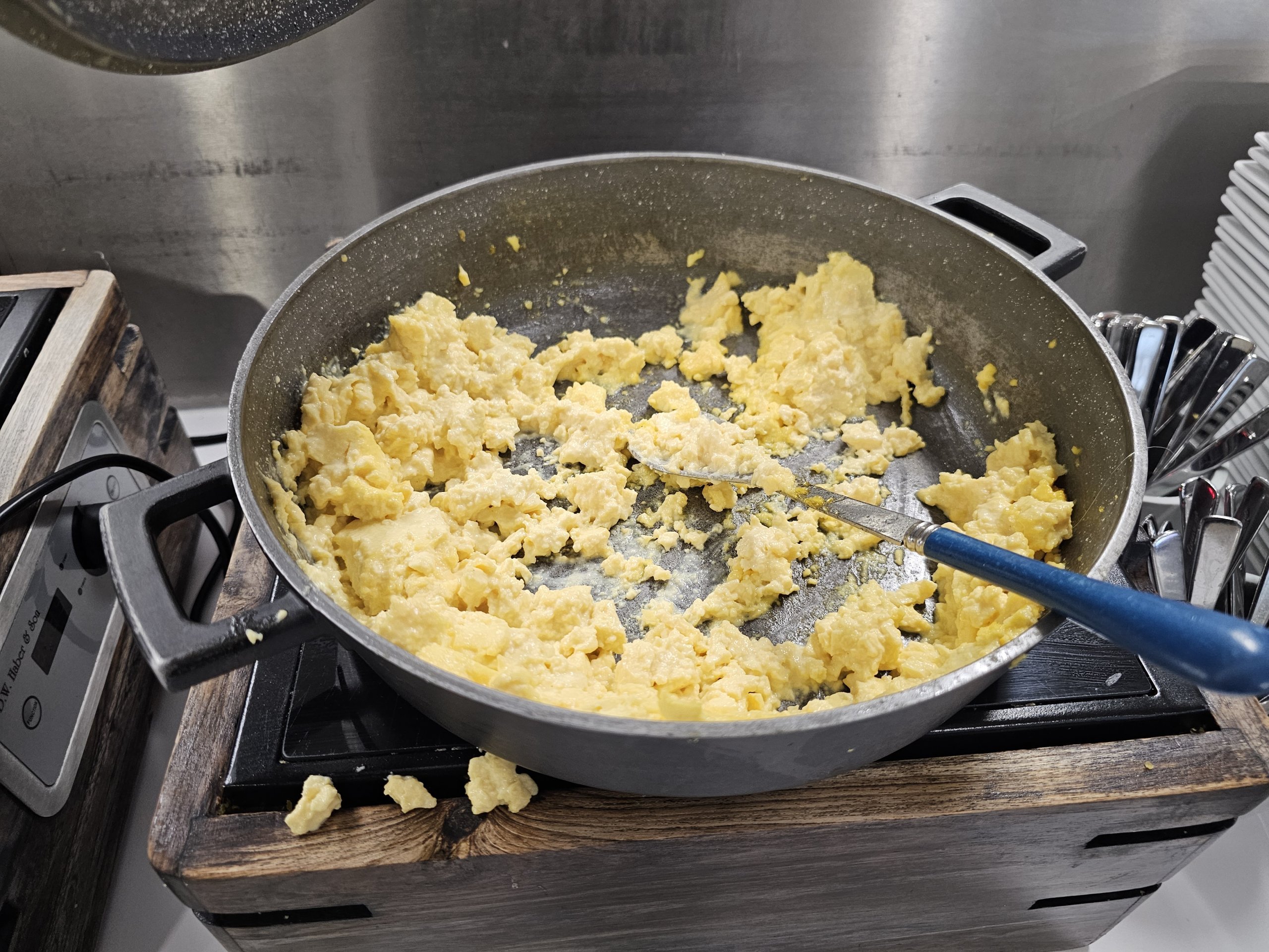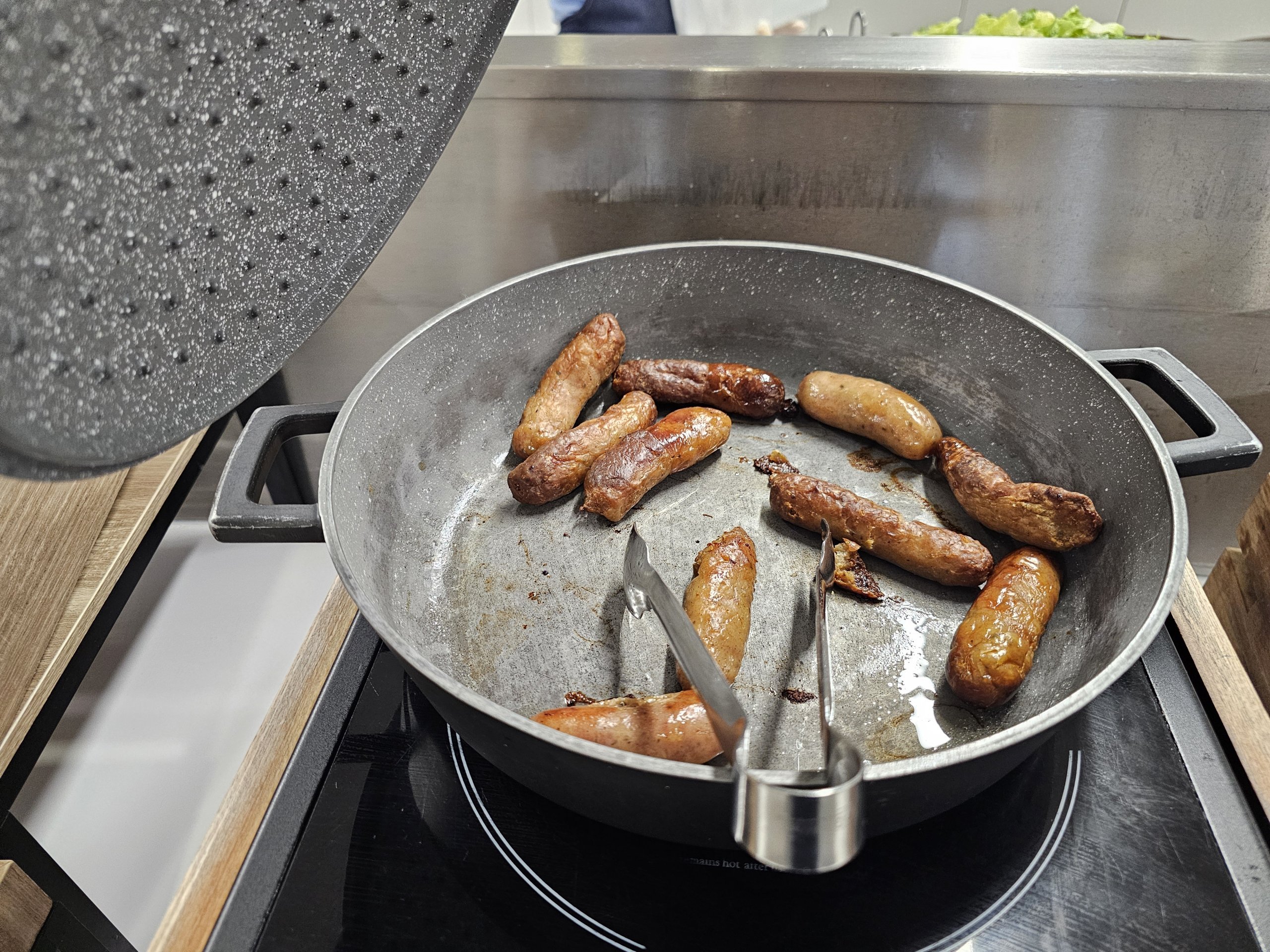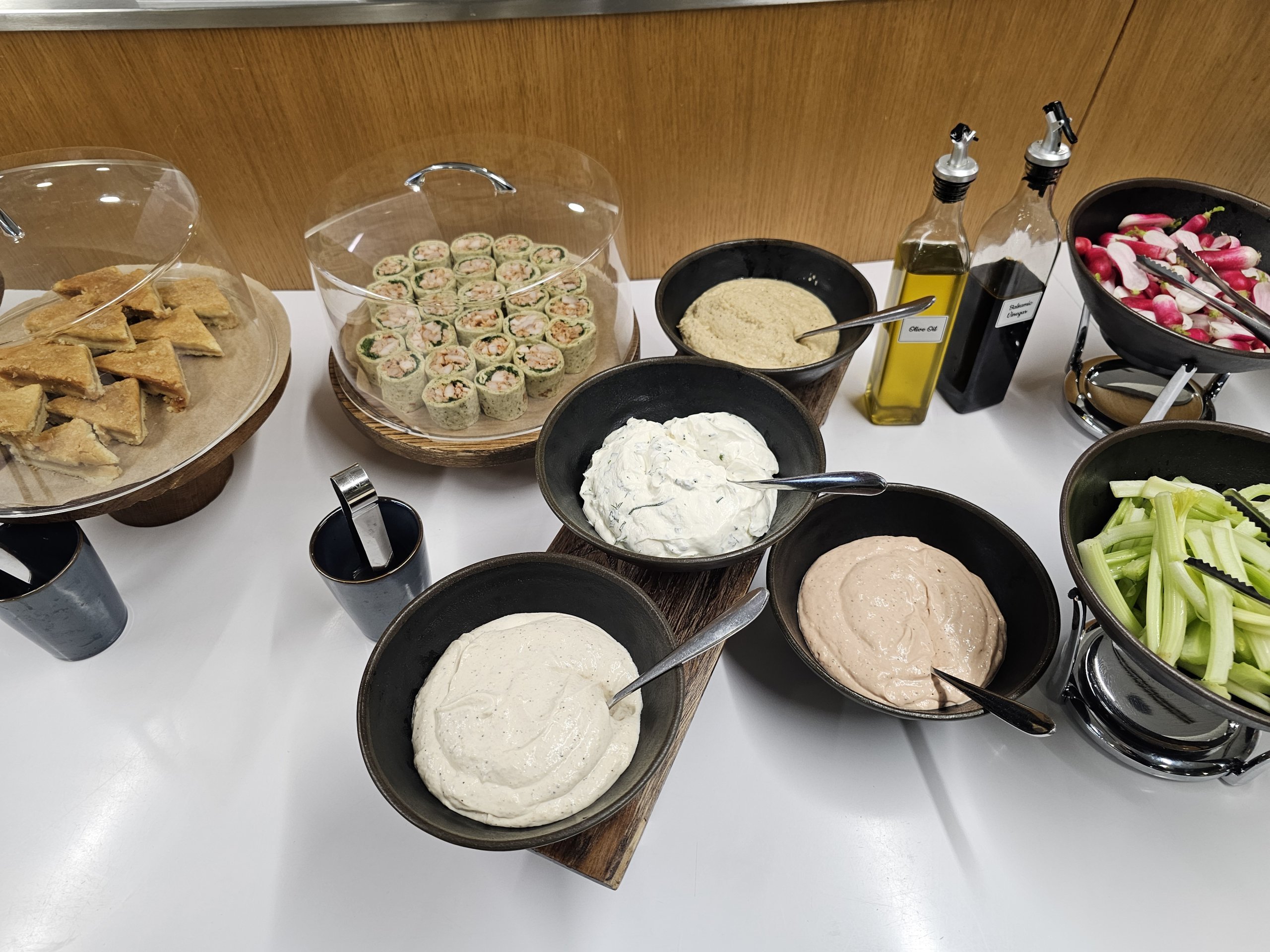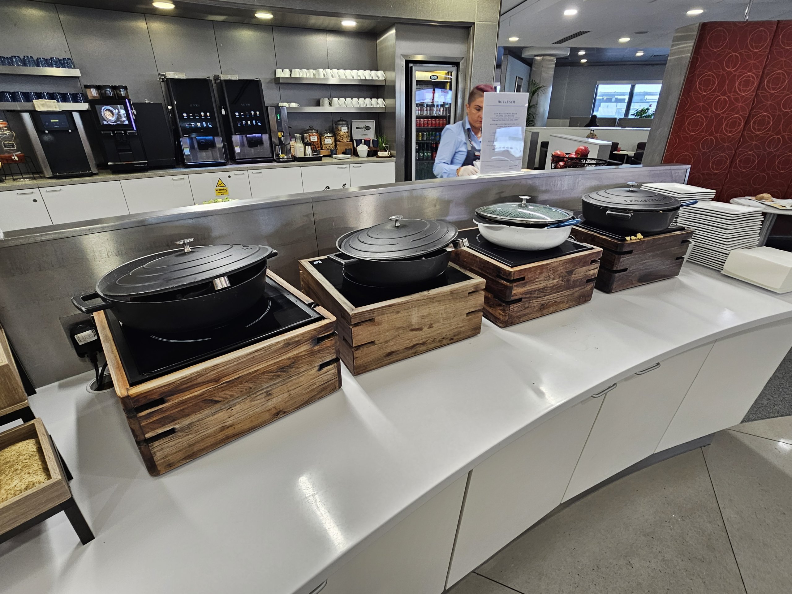 Makanan panas memiliki menu sarapan (hingga sekitar pukul 11:30) dan menu makan siang (hingga waktu penutupan lounge). Sup tersedia sepanjang hari.