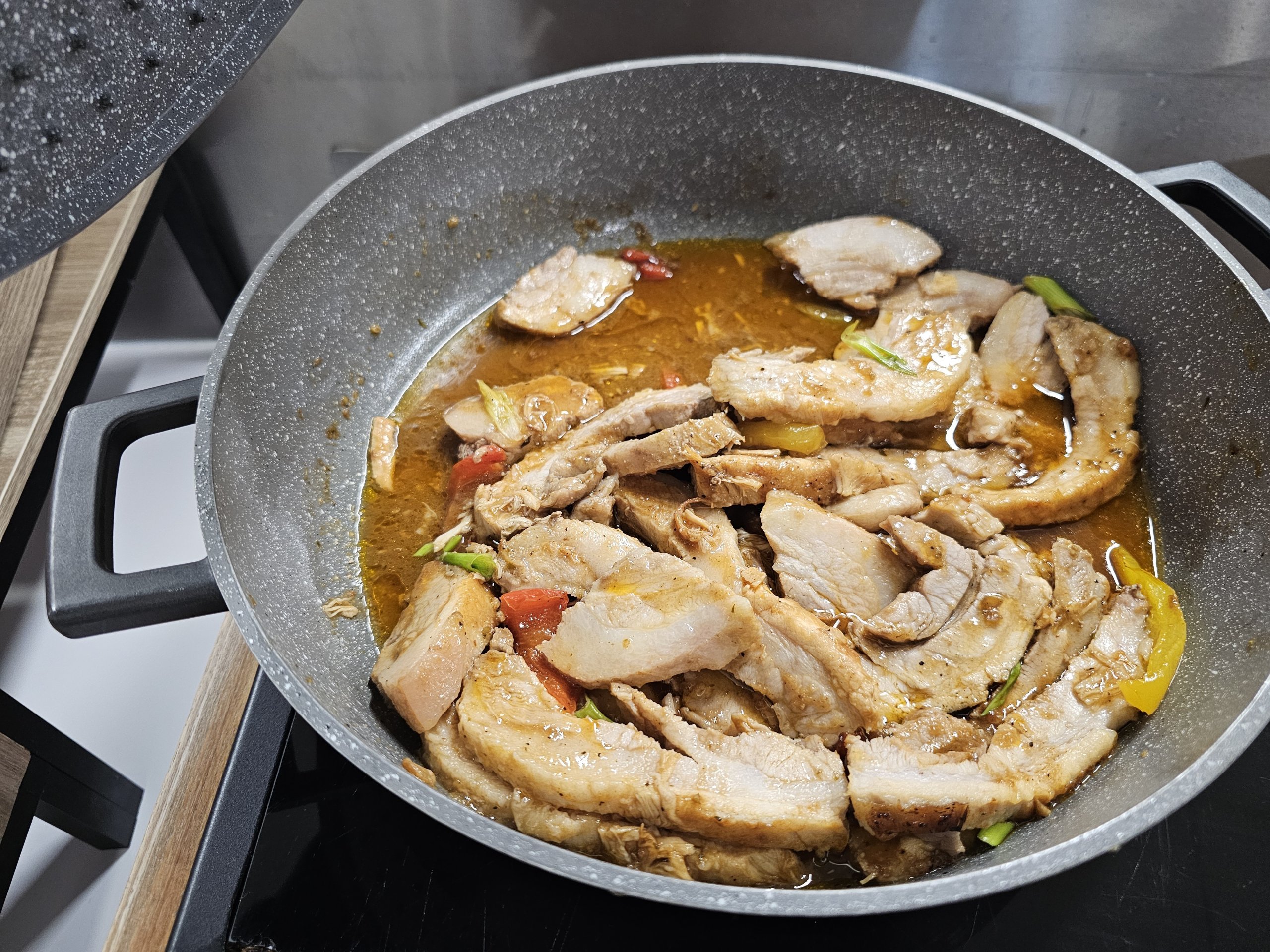 Menu makan siang pada hari kunjungan kami termasuk kentang rebus, pasta dengan jamur dan daging babi yang sangat berlemak.