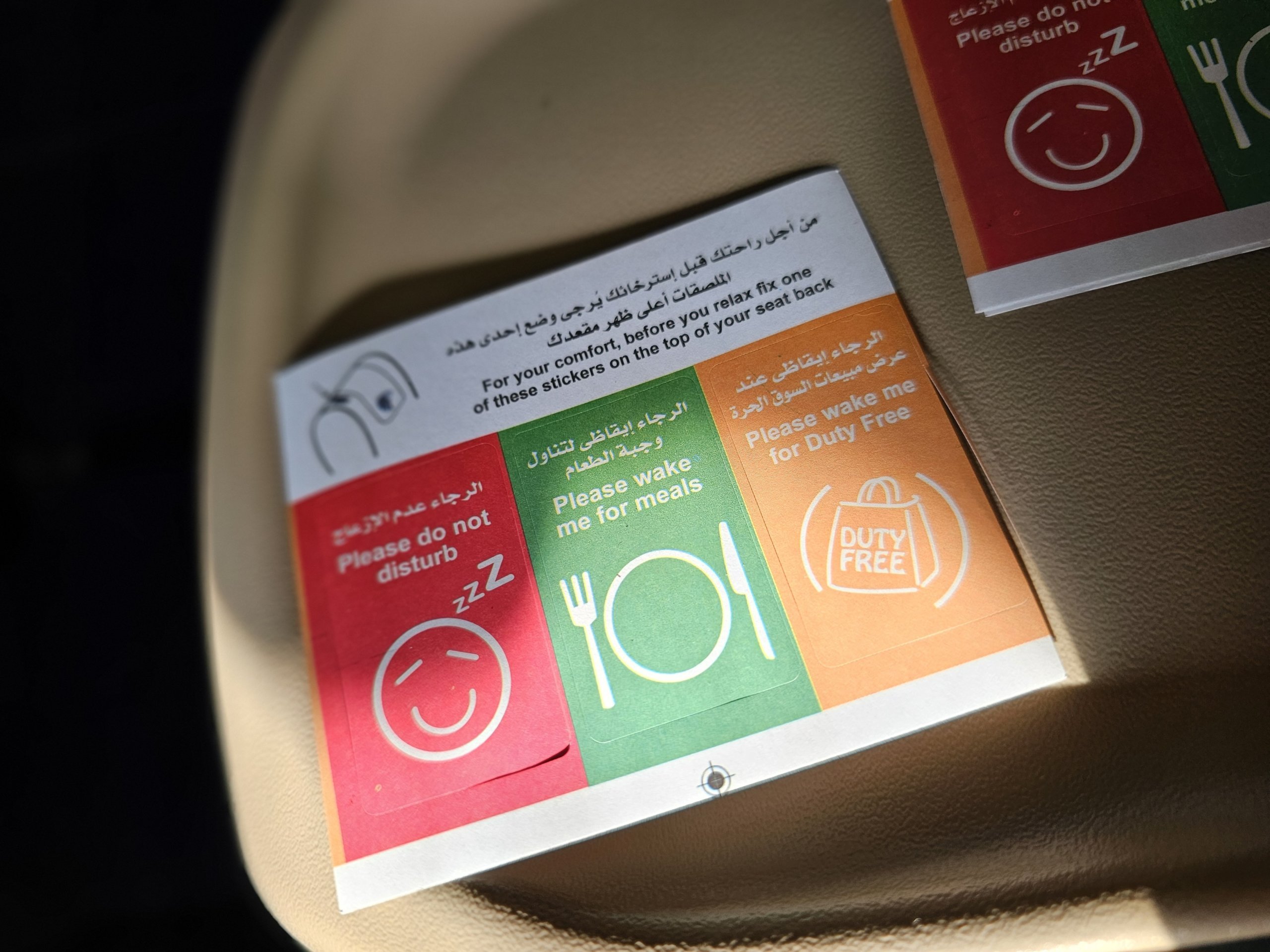 Detail yang bagus adalah stiker dengan informasi untuk kru, apakah Anda ingin dibangunkan untuk makan atau, sebaliknya, tidak ingin diganggu selama penerbangan. Anda menempelkan stiker pilihan Anda di bagian atas kursi Anda.