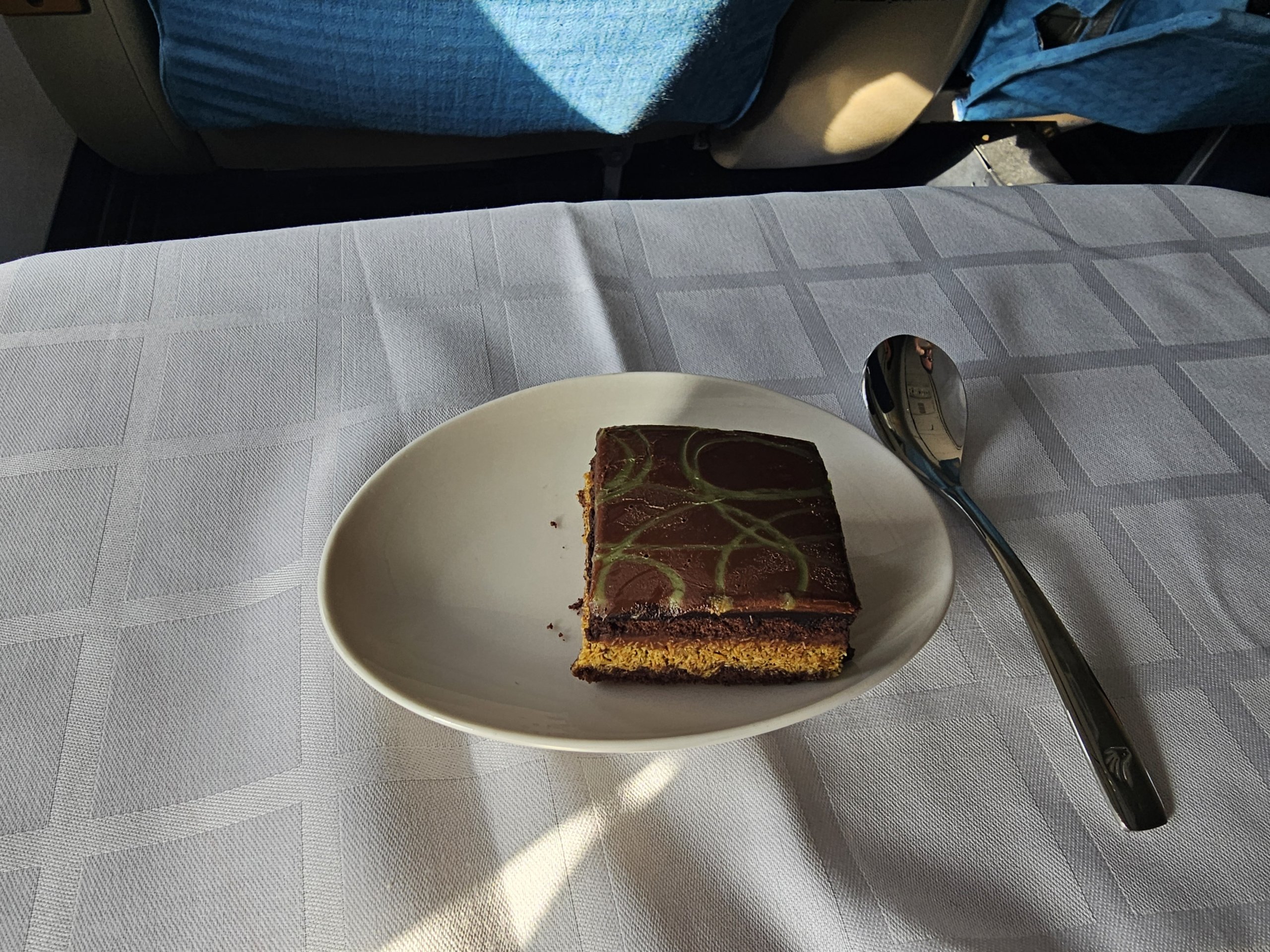 Sekitar 20 menit setelah lepas landas, layanan pertama datang dalam bentuk minuman ringan dan kue kecil.