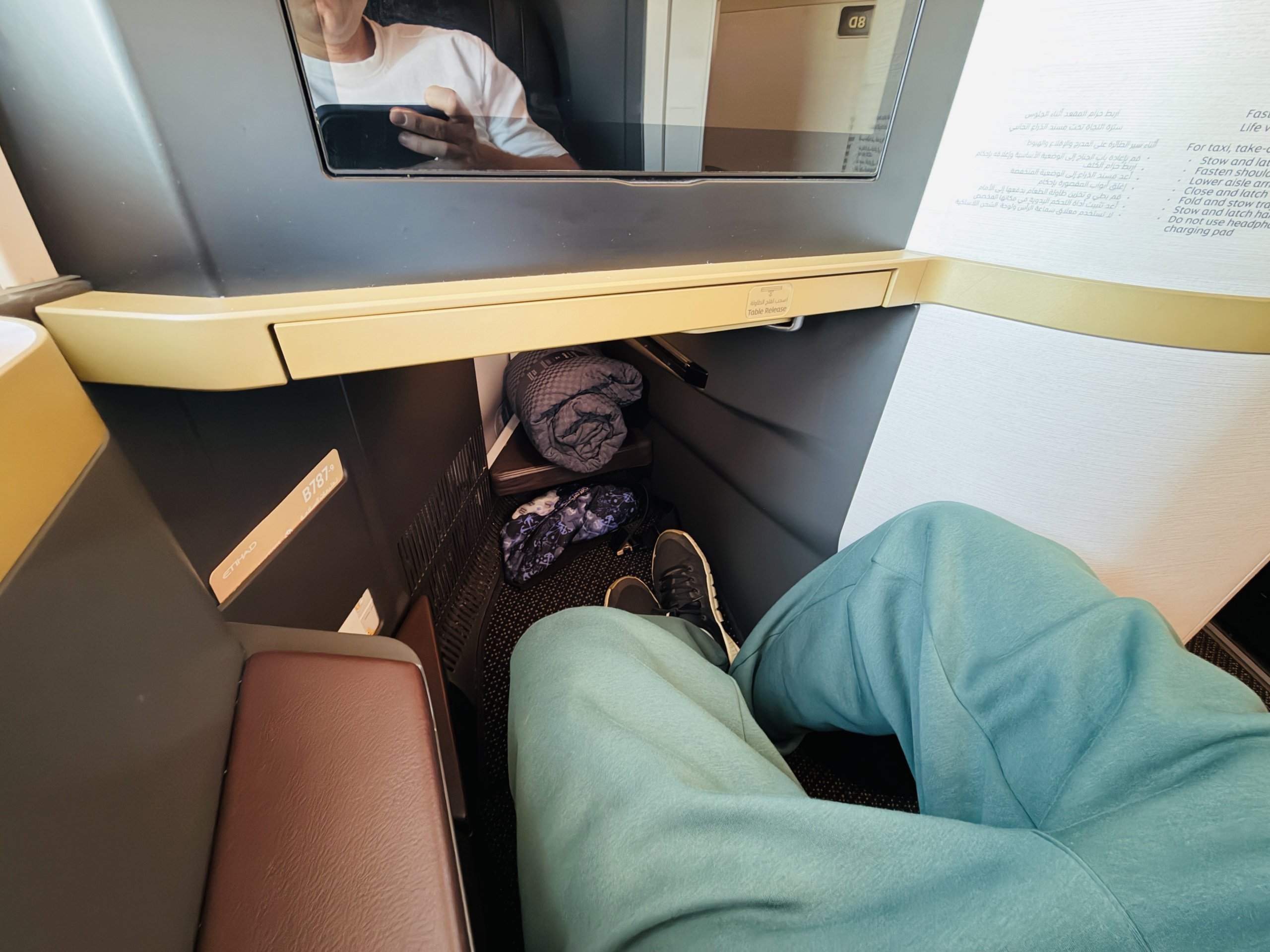 Bagi saya, kabin pesawat ini memiliki tata letak tempat duduk 1-2-1 yang ideal, dengan bonus tambahan semua kursi menghadap ke arah penerbangan dibandingkan dengan pesawat Etihad B789 lainnya.