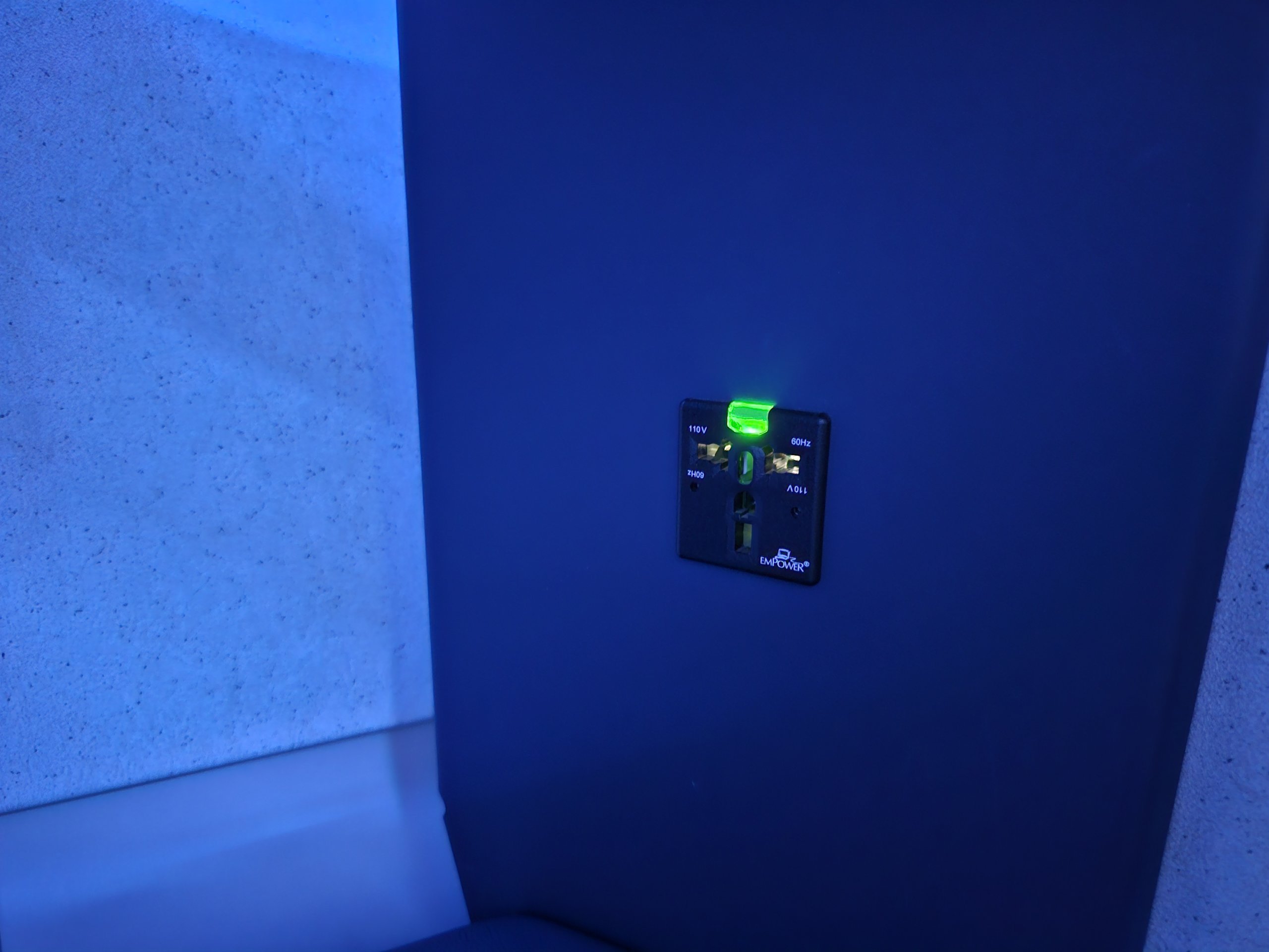 Suasana elegan semakin terasa dengan pencahayaan malam yang berwarna biru, saat penerbangan kami berangkat pada pukul 4:35 pagi.