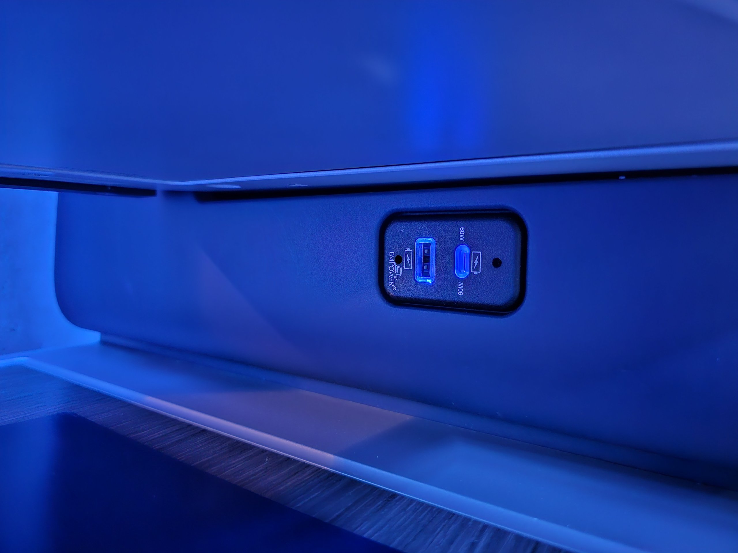 Kursi ini memiliki port USB-A dan USB-C, serta stopkontak universal untuk mengisi daya perangkat elektronik.