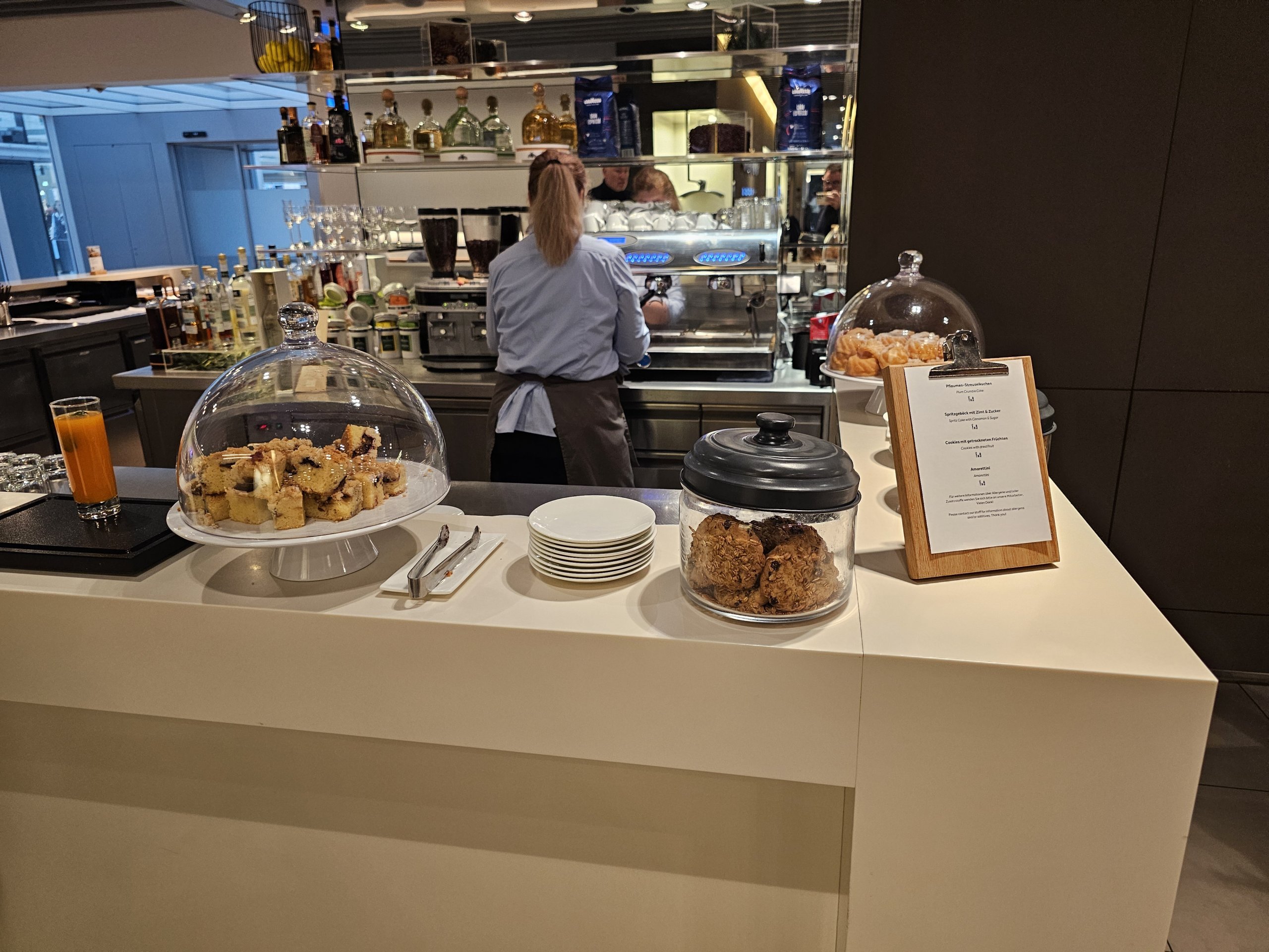 Sejujurnya, saya tidak melihat banyak perbedaan dari ruang tunggu Kelas Bisnis Lufthansa yang standar. Perbedaan utamanya adalah adanya bar dengan pilihan minuman beralkohol yang jauh lebih banyak, tetapi karena saya hanya minum sedikit alkohol saat bepergian sendiri, perubahan ini sama sekali tidak signifikan bagi saya.
