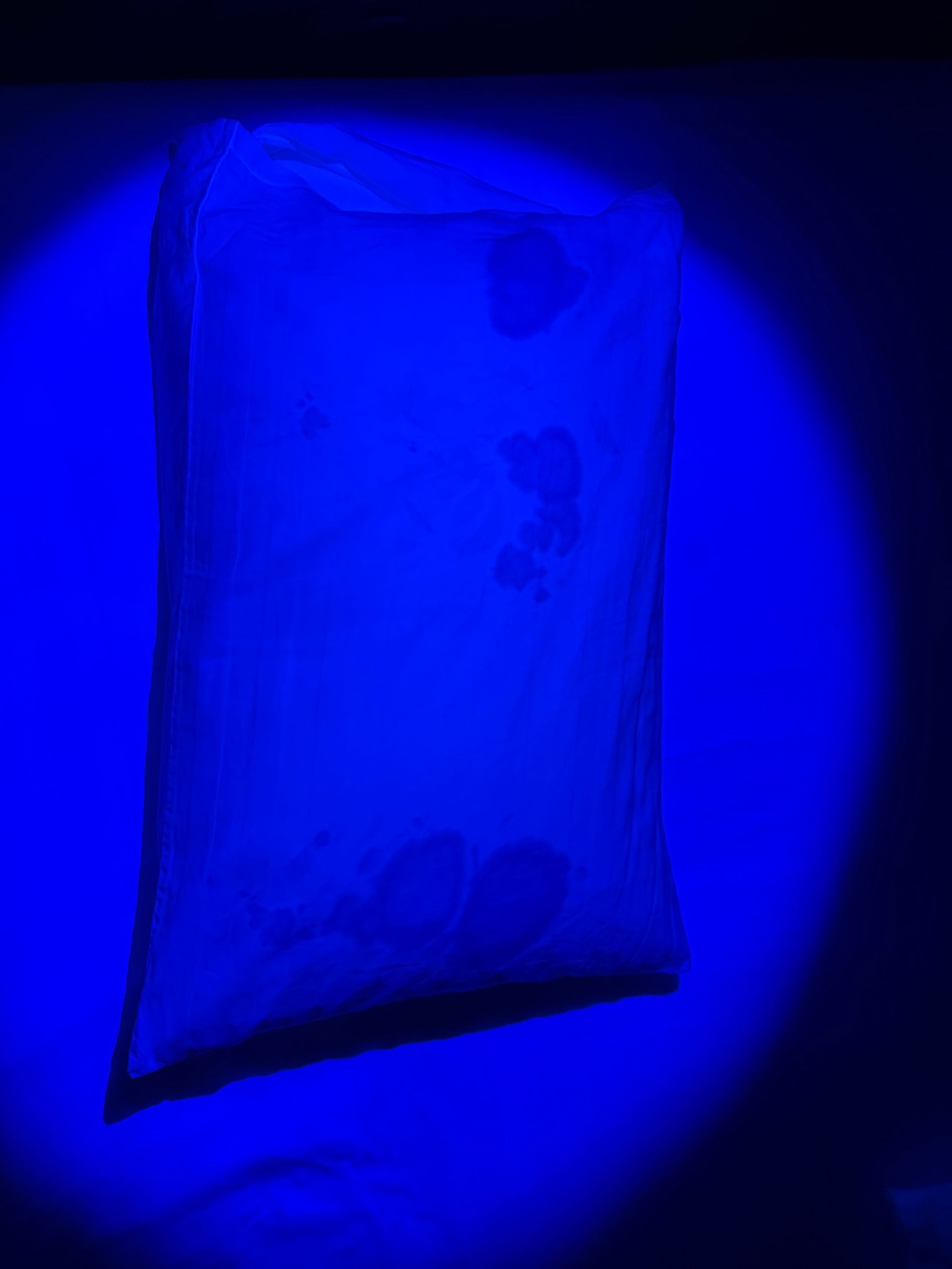 Di bawah sinar UV (ya, kami telah mengujinya 😄) ada noda aneh di bantal. Mungkin dari darah atau anggur? Apakah Anda punya tips?